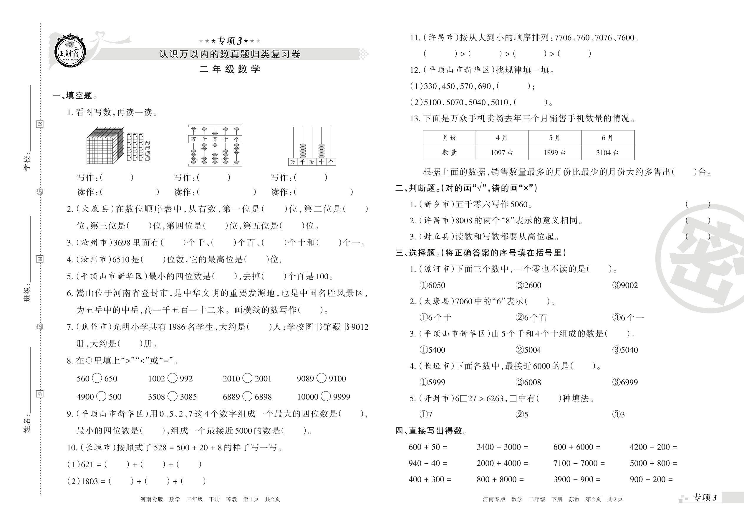 王朝霞期末专项卷——认识万以内的数、两、三位数的加法和减法真题归类复习二年级下册数学(苏教版)【0】