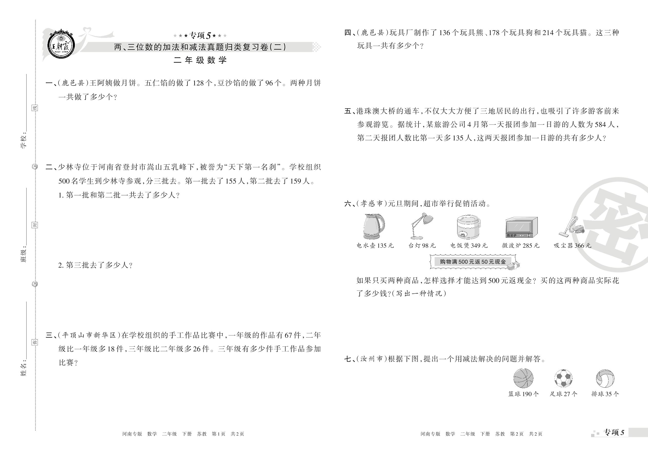 二年级数学苏教版下册专项卷