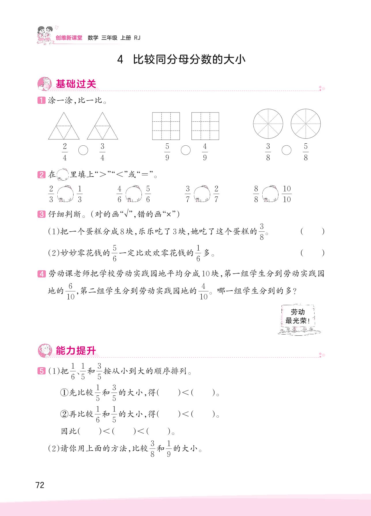 2023上册三年级数学人教版 八 分数的初步认识——4 比较同分母分数的大小