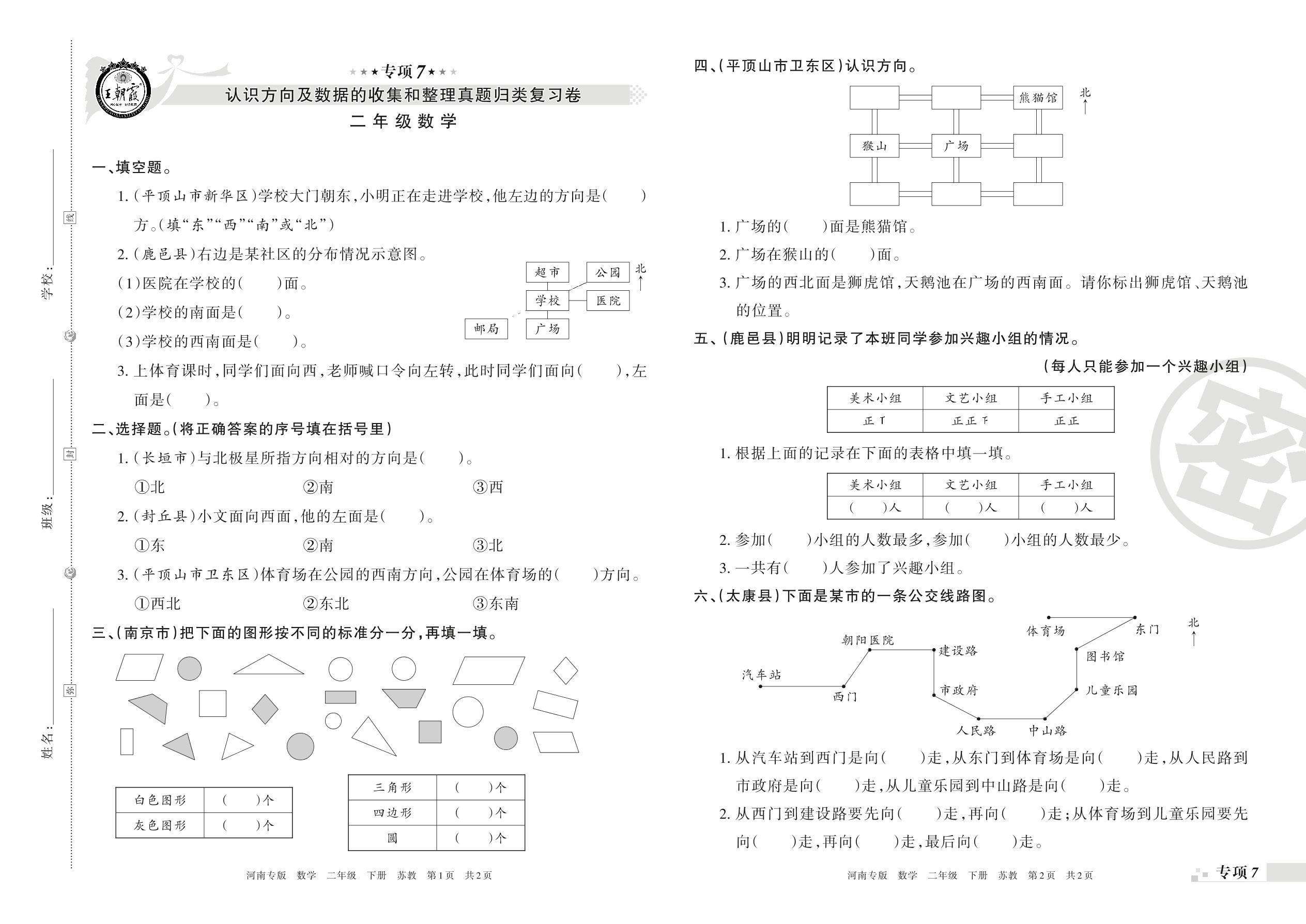 王朝霞期末专项卷——认识方向及数据的收集和整理真题归类复习、新颖题速递:生活与数学二年级下册数学(苏教版)【0】
