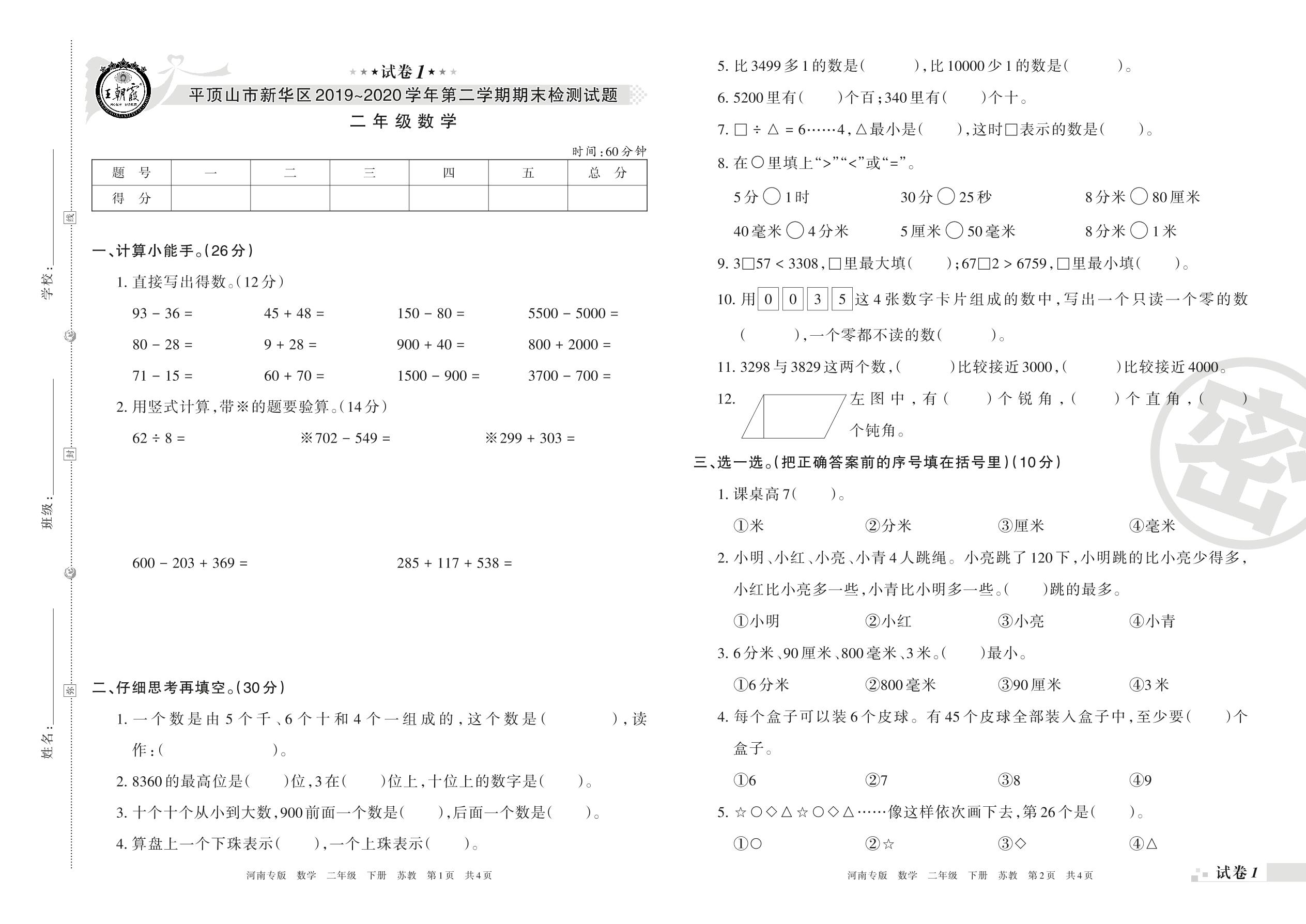 2019-2020学年第二学期平顶山市新华区二年级数学试卷(苏教版)_R21080383133【1】