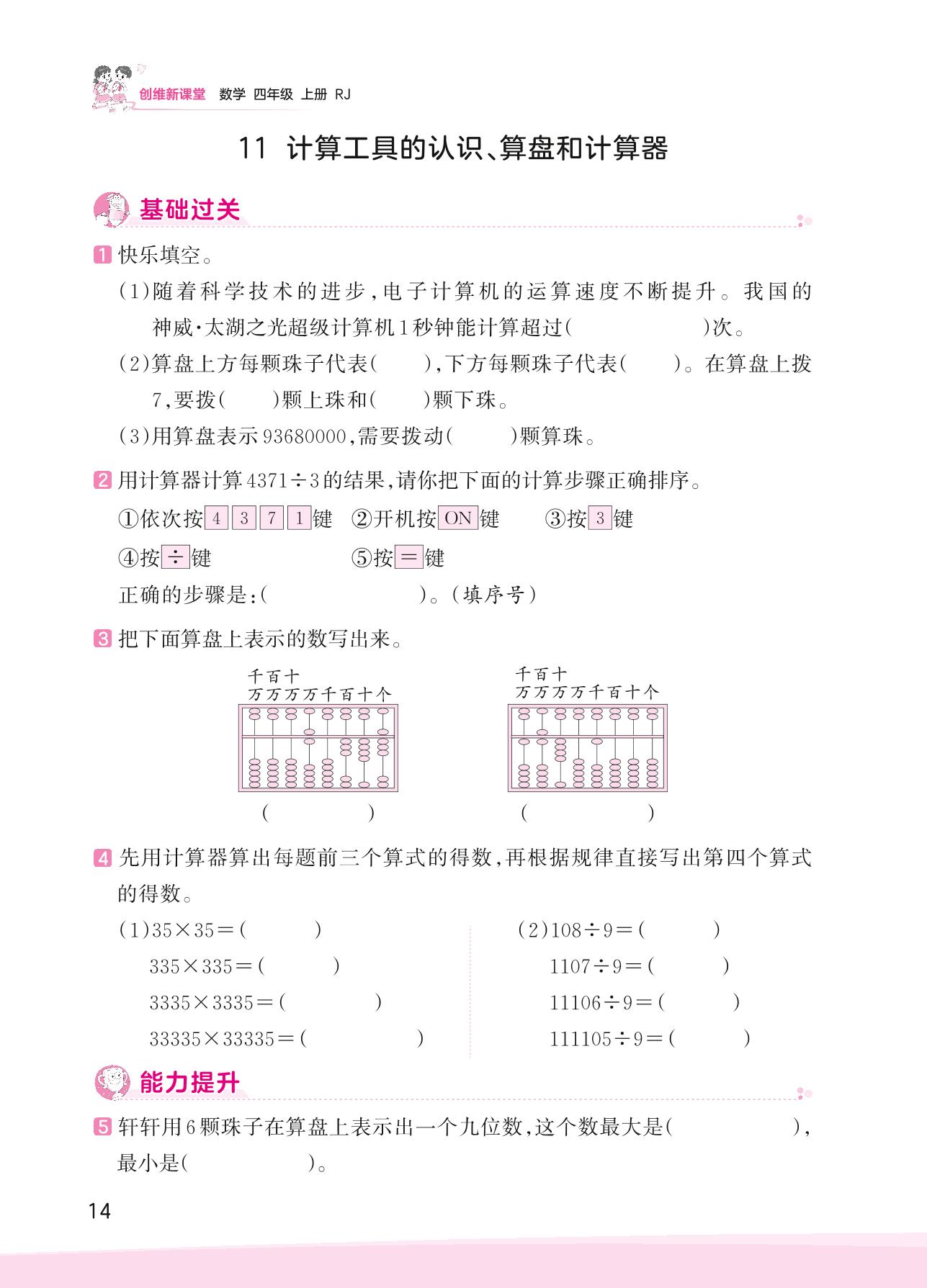 2023上册四年级数学人教版 一 大数的认识 ——11 计算工具的认识、算盘和计算器