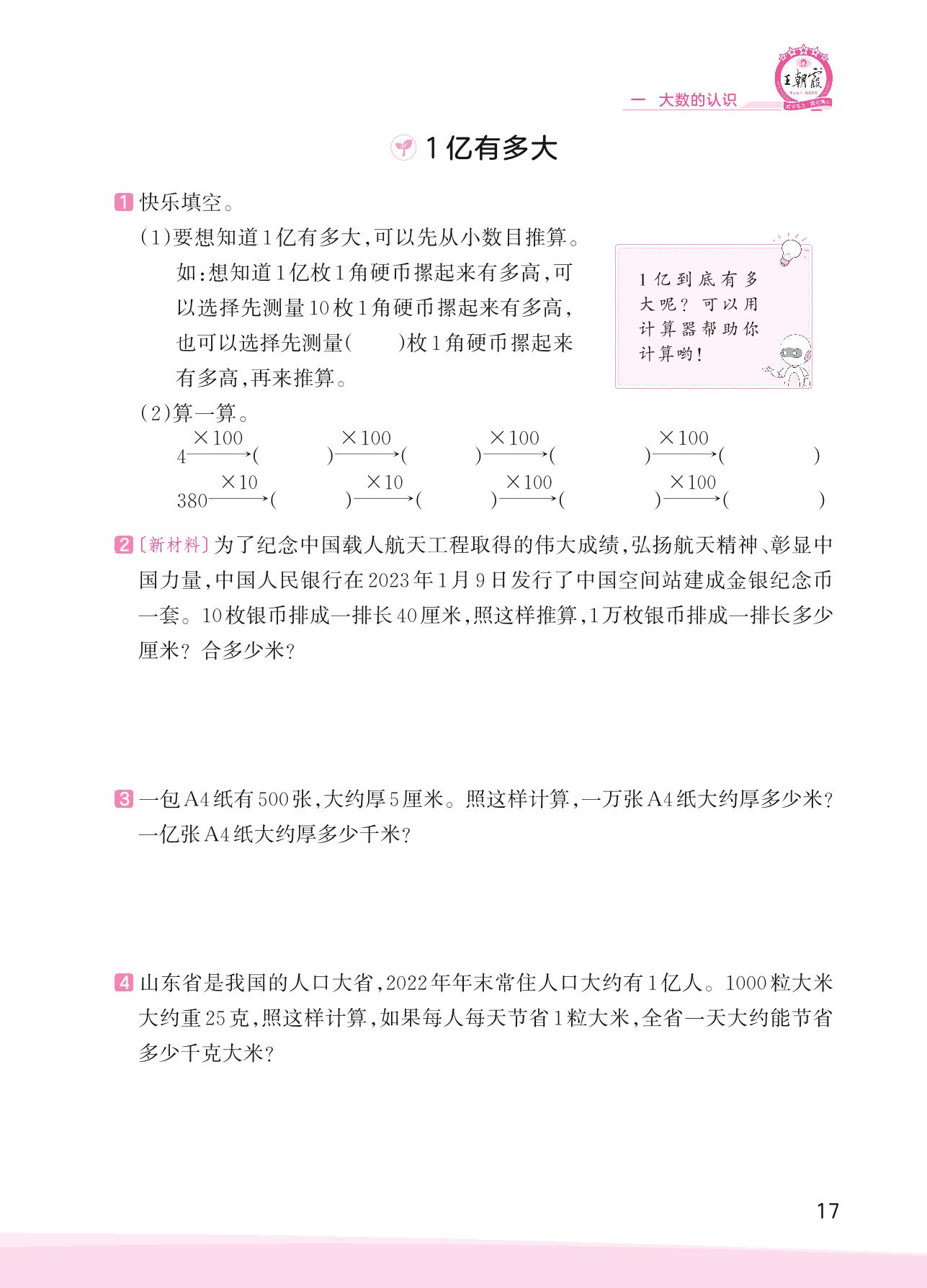 2023上册四年级数学人教版 一 大数的认识 ——1亿有多大