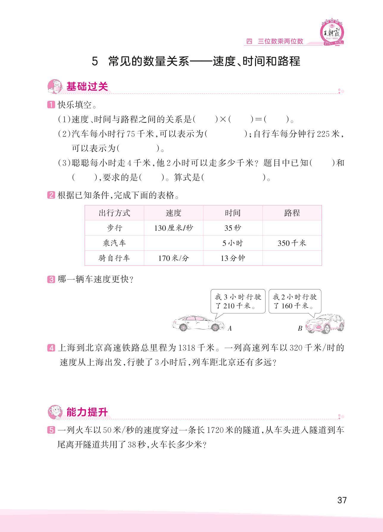 2023上册四年级数学人教版 四 三位数乘两位数——5 常见的数量关系——速度、时间和路程