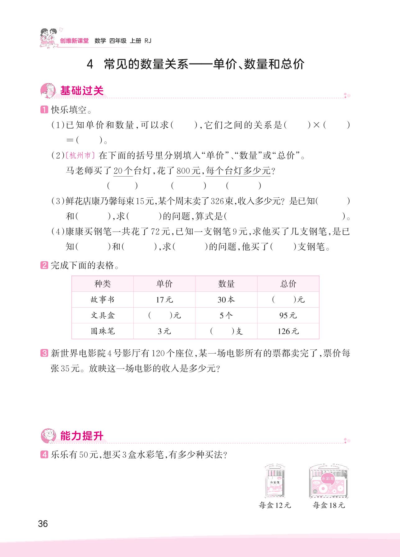 2023上册四年级数学人教版 四 三位数乘两位数——4 常见的数量关系——单价、数量和总价