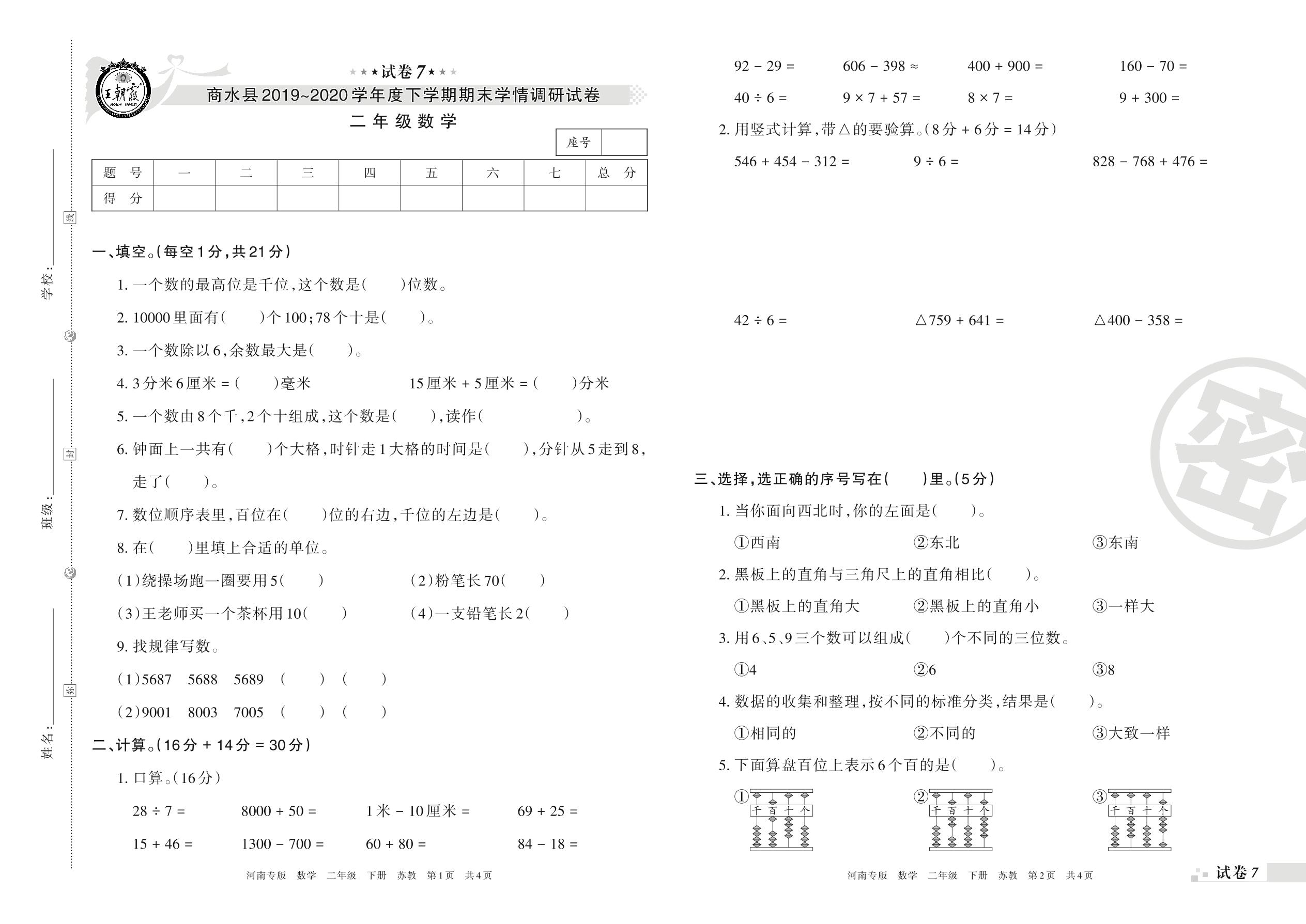 2019-2020学年第二学期周口市商水县二年级数学试卷(苏教版)【7】