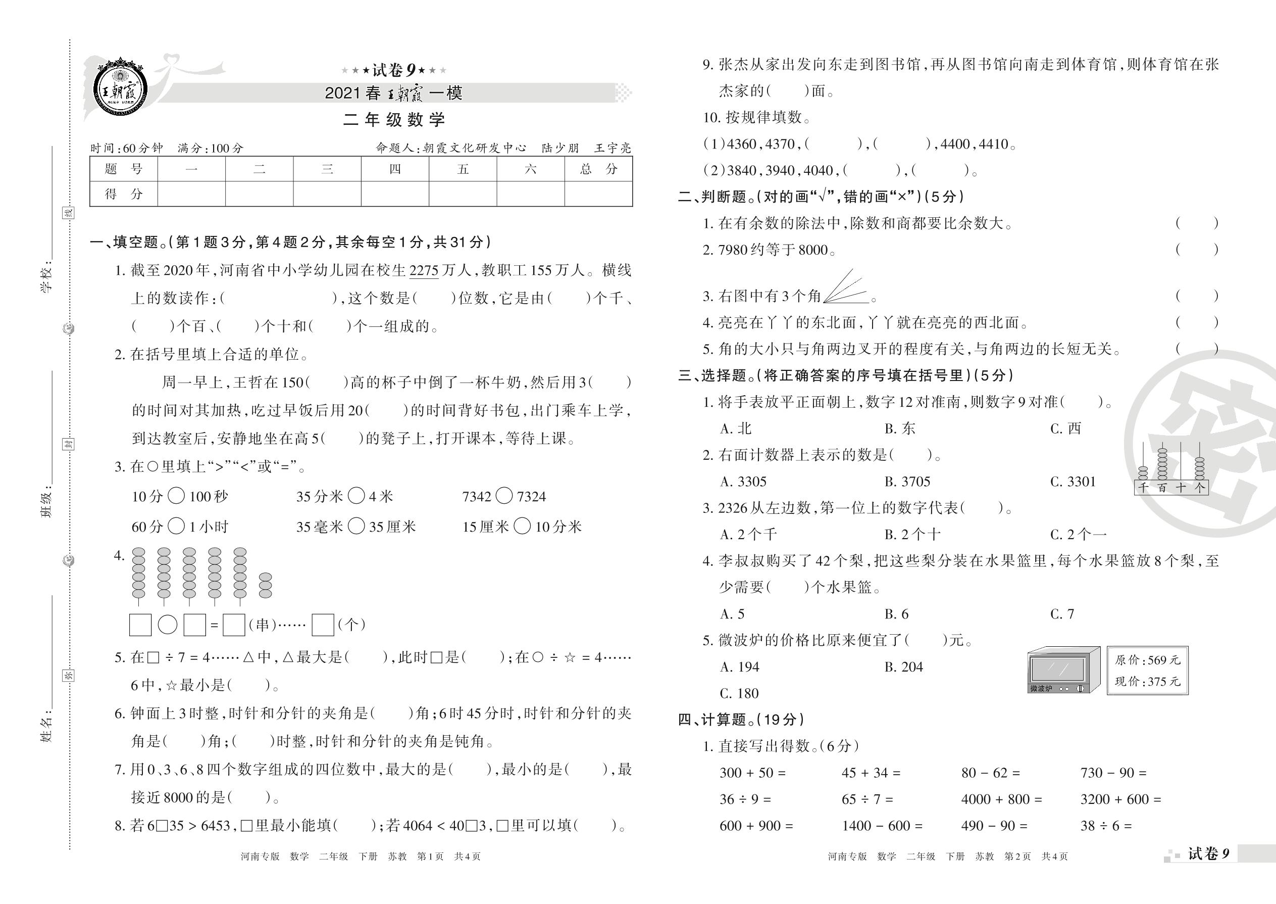 王朝霞期末模拟卷二年级下册数学(苏教版)_R21080383204【9】