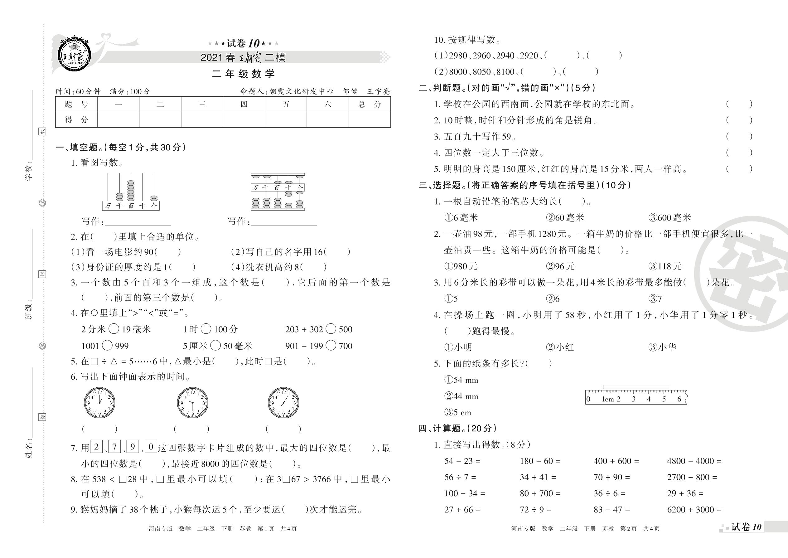 王朝霞期末模拟卷二年级下册数学(苏教版)_R21080383208【10】