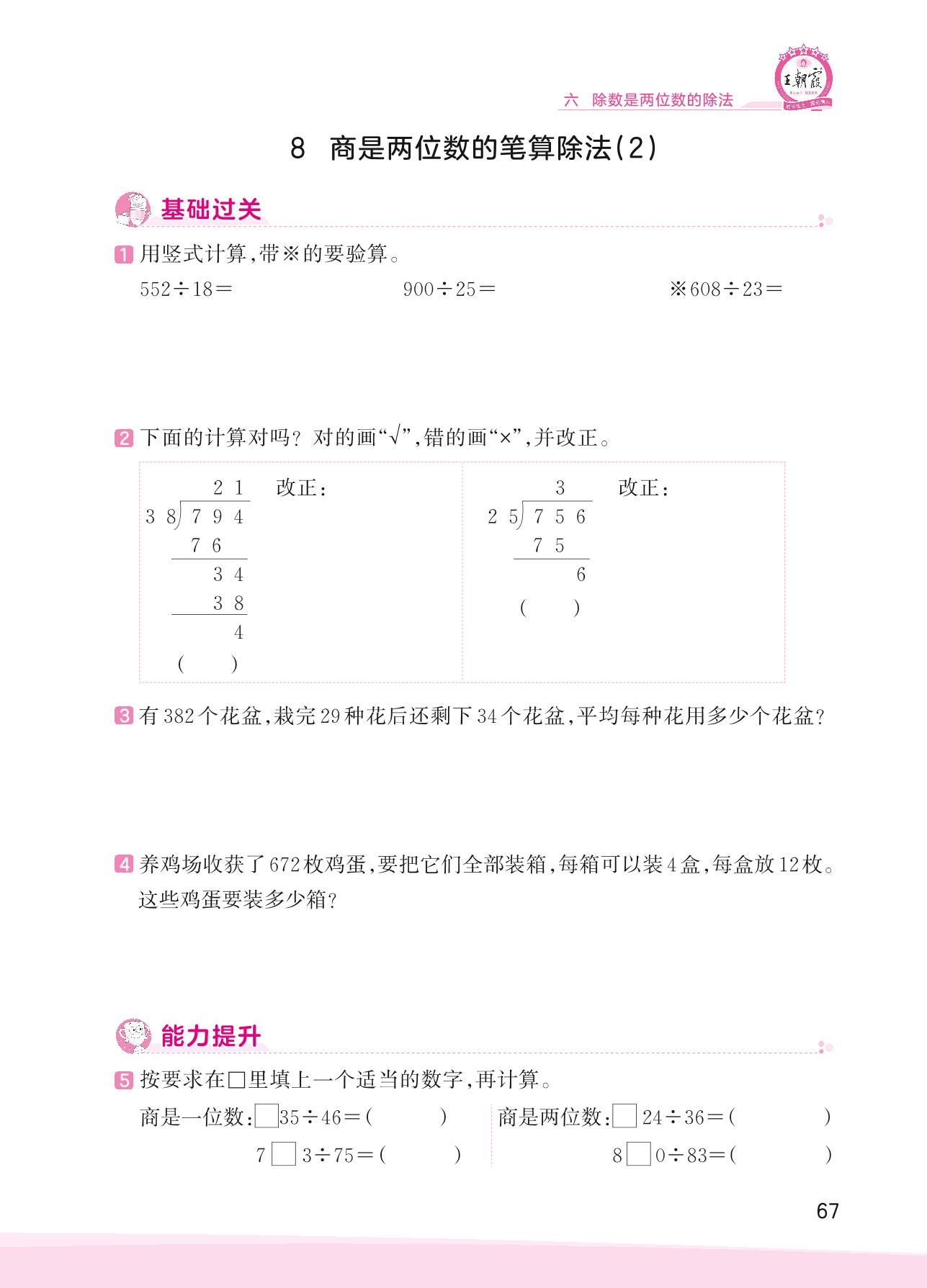 2023上册四年级数学人教版 六 除数是两位数的除法——8 商是两位数的笔算除法(2)