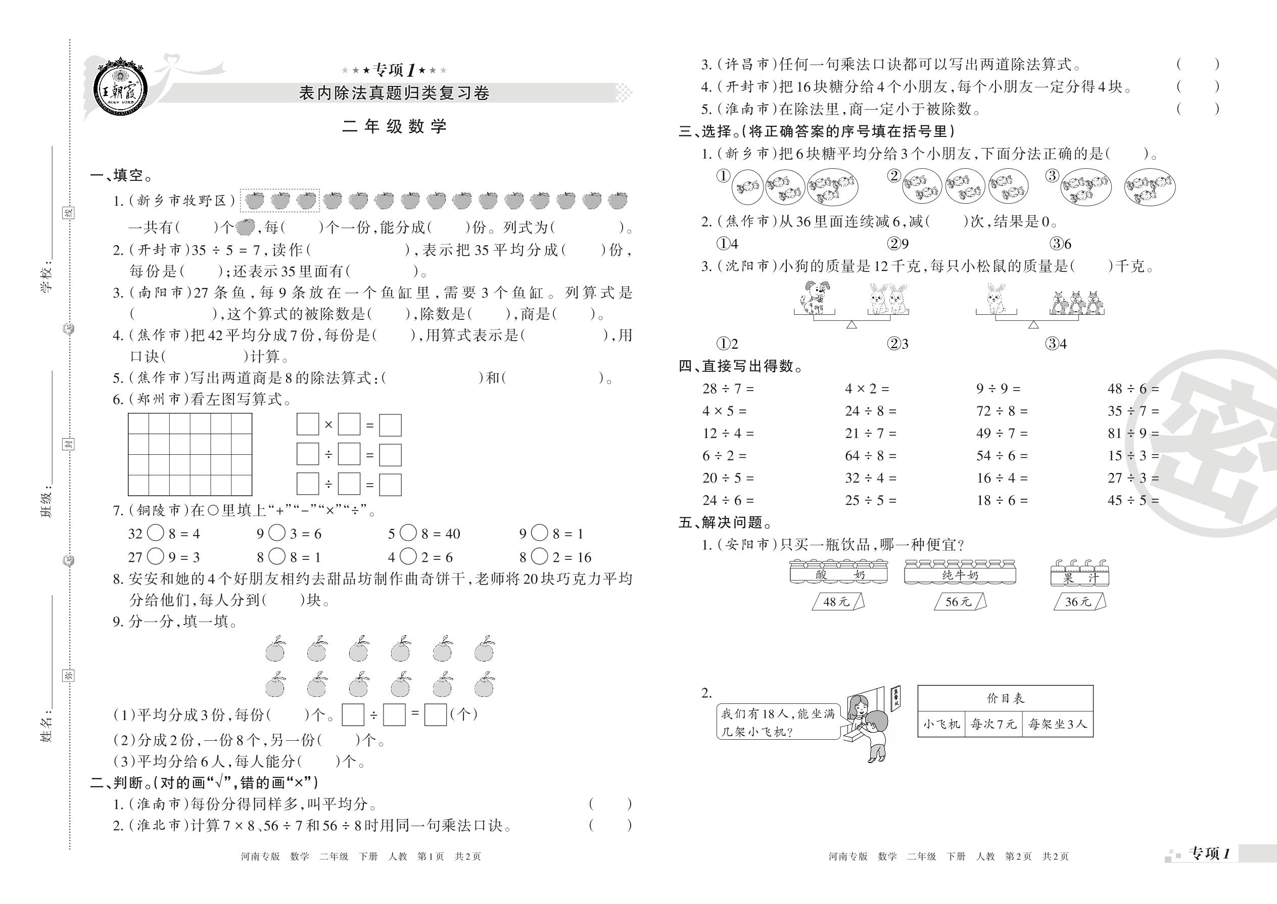 王朝霞期末专项卷——表内除法、混合运算真题归类复习二年级下册数学(人教版)【0】