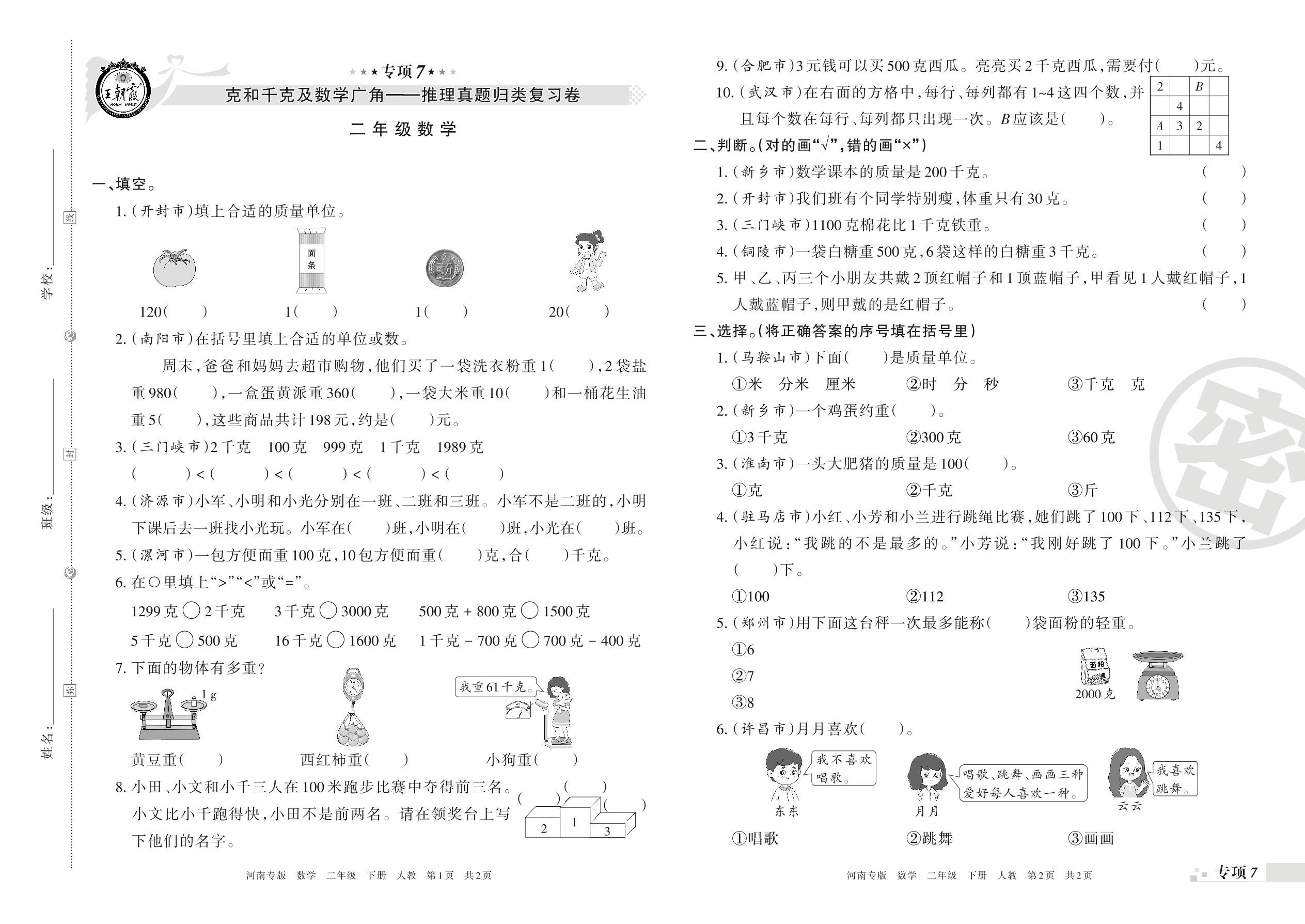王朝霞期末专项卷——克和千克及数学广角——推理真题归类复习、新颖题速递:生活与数学二年级下册数学(人教版)【0】