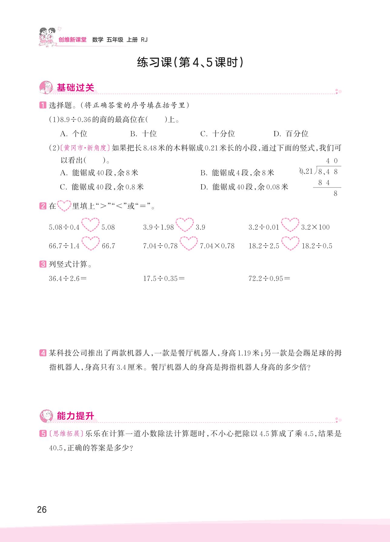 2023上册五年级数学人教版 三 小数除法——练习课(第4、5课时)