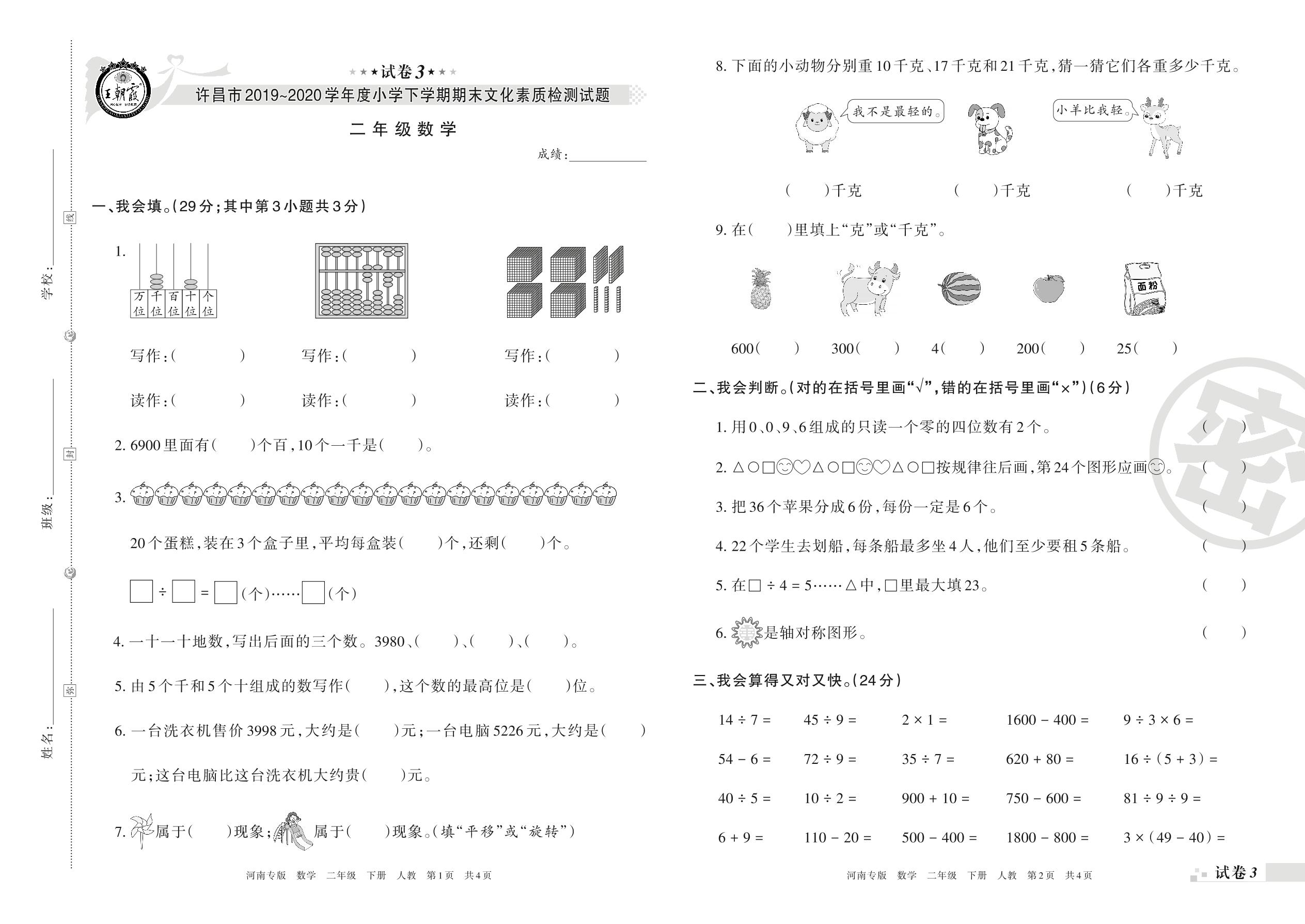 2019-2020学年第二学期许昌市二年级数学试卷(人教版)【3】