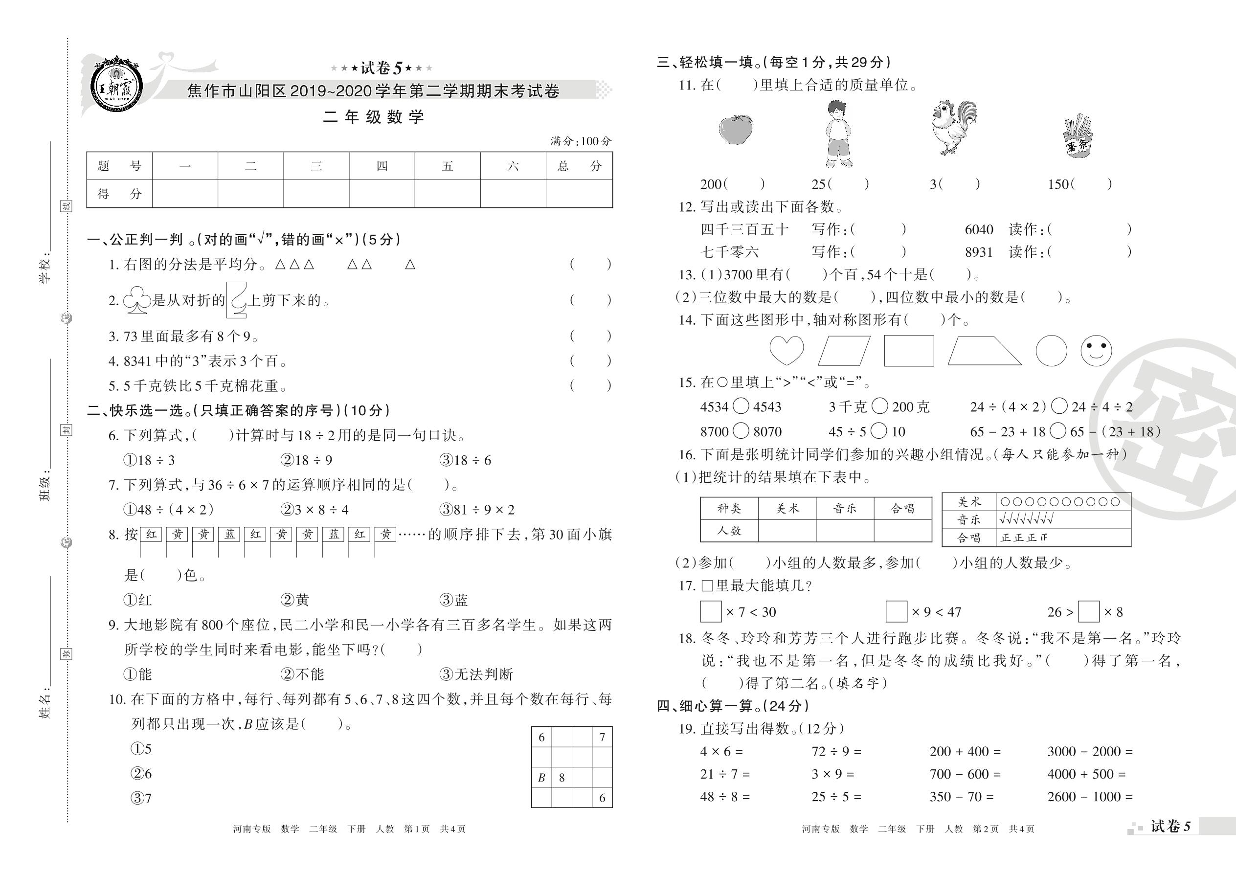 2019-2020学年第二学期焦作市山阳区二年级数学试卷(人教版)【5】