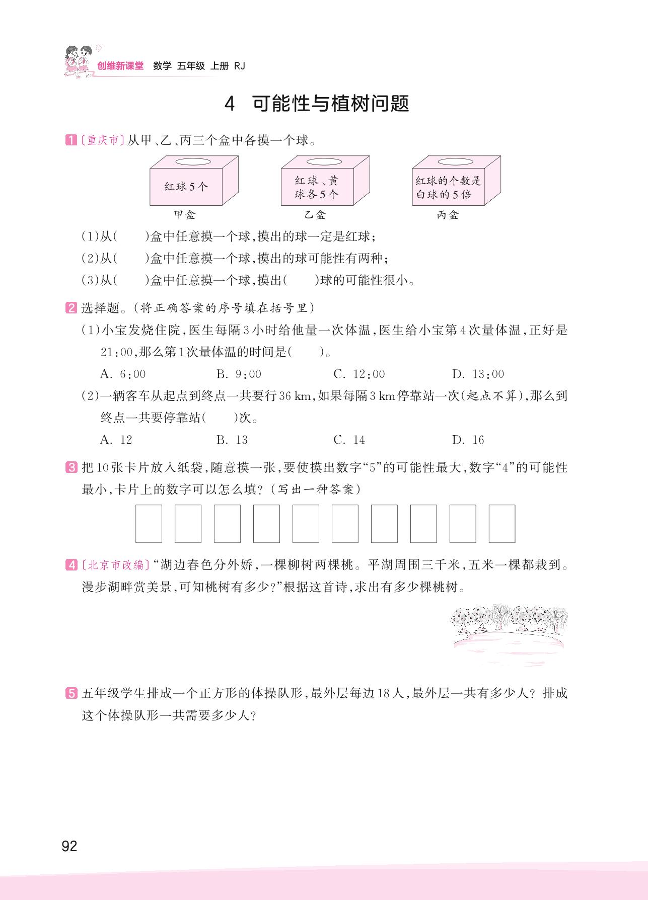 2023上册五年级数学人教版 总复习——4 可能性与植树问题