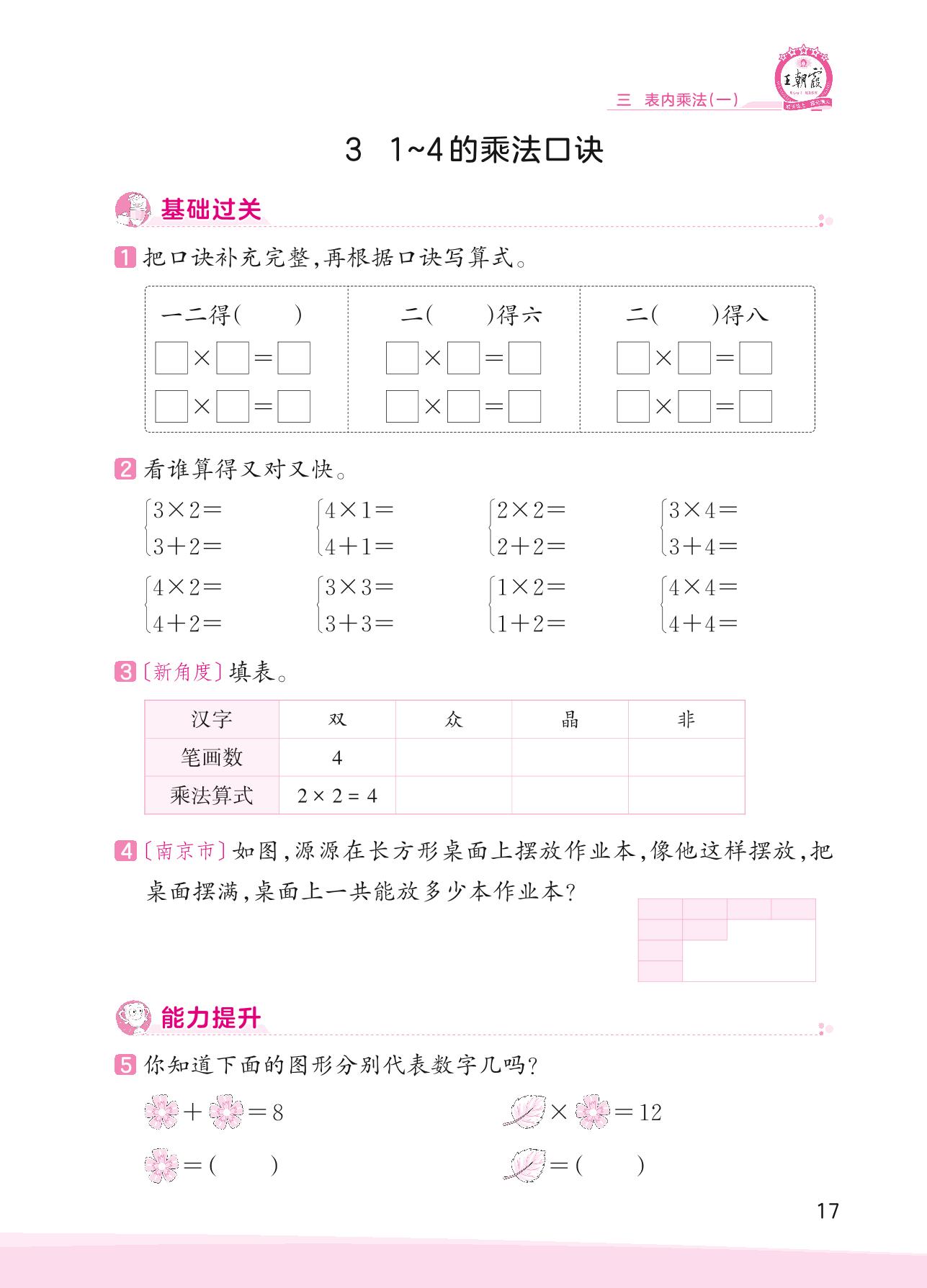 2023上册二年级数学苏教版 三 表内乘法(一)——3 1~4的乘法口诀