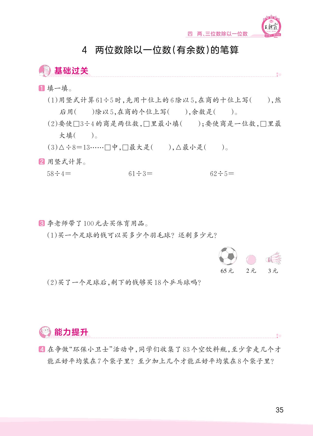 2023上册三年级数学冀教版 四 两、三位数除以一位数——4 两位数除以一位数(有余数)的笔算