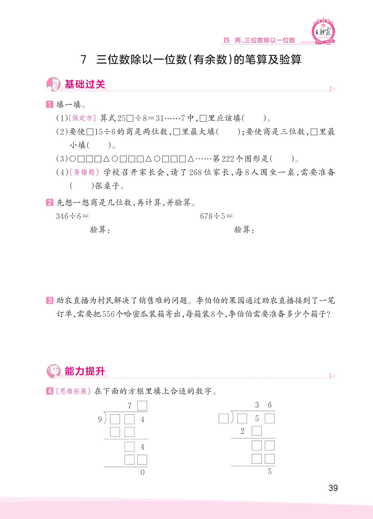 2023上册三年级数学冀教版 四 两、三位数除以一位数——7 三位数除以一位数(有余数)的笔算及验算