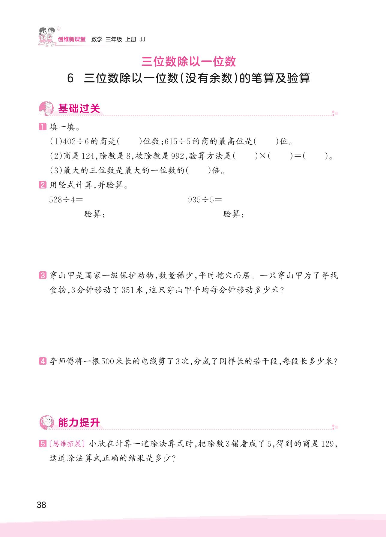 2023上册三年级数学冀教版 四 两、三位数除以一位数——6 三位数除以一位数(没有余数)的笔算及验算