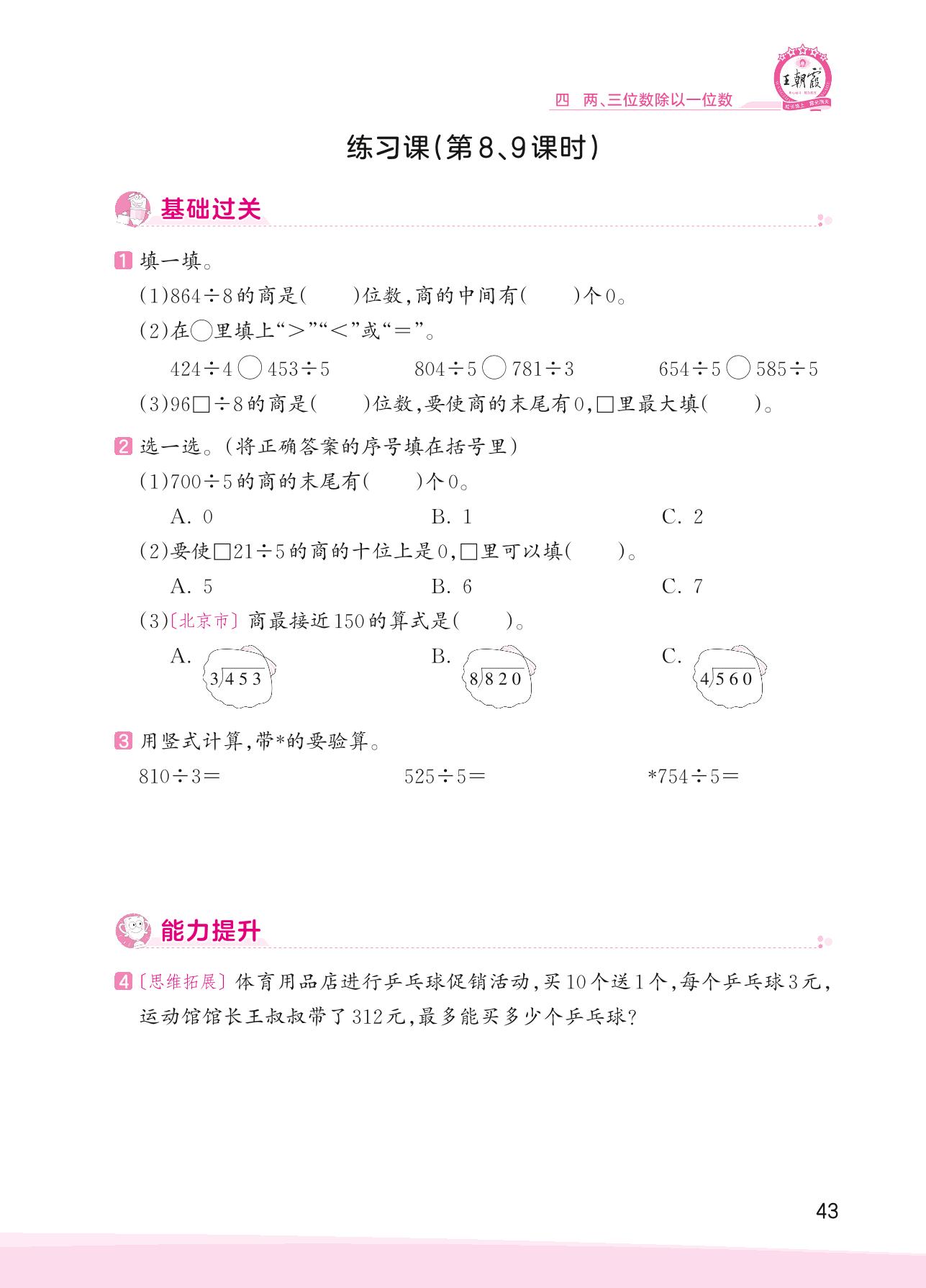 2023上册三年级数学冀教版 四 两、三位数除以一位数——练习课(第8、9课时)
