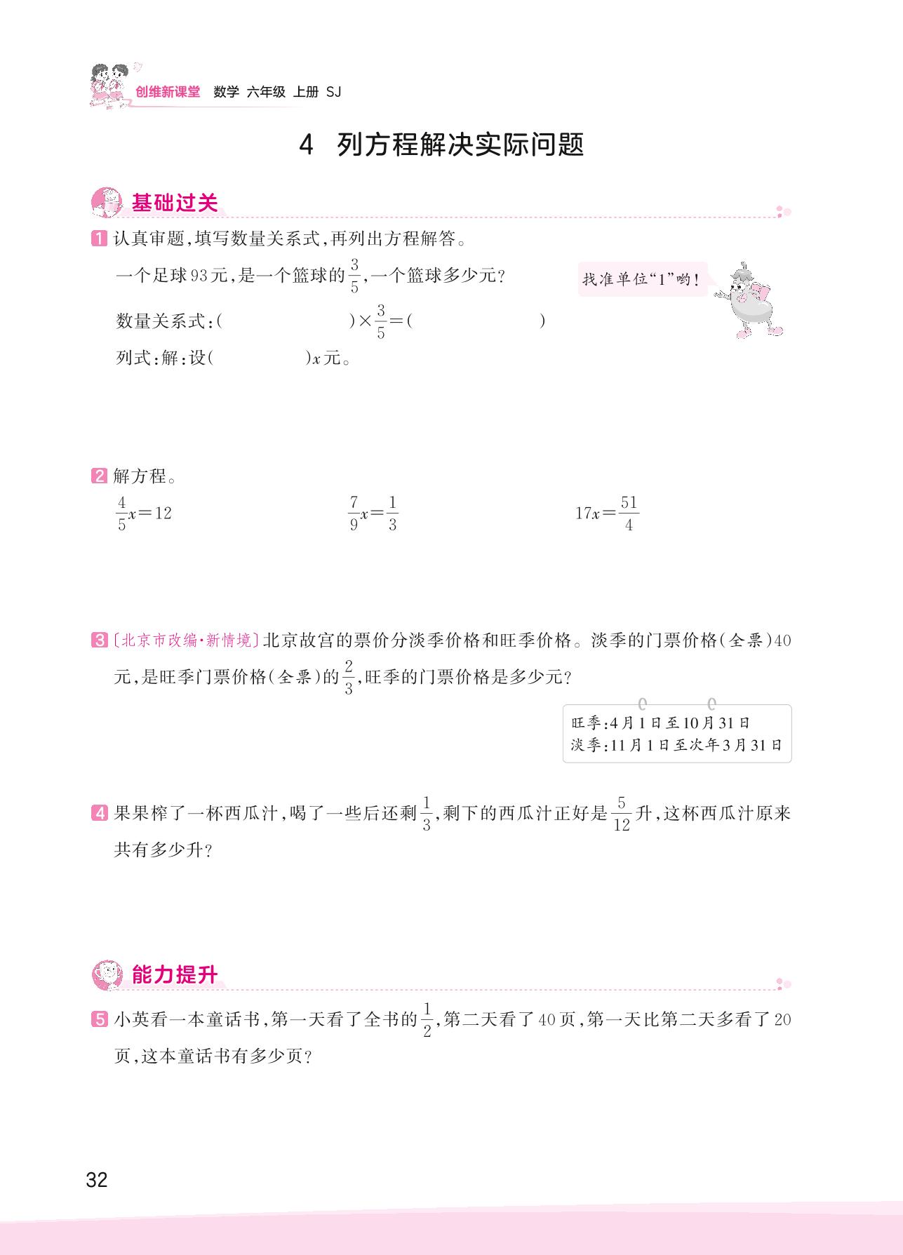 2023上册六年级数学苏教版 三 分数除法——4 列方程解决实际问题