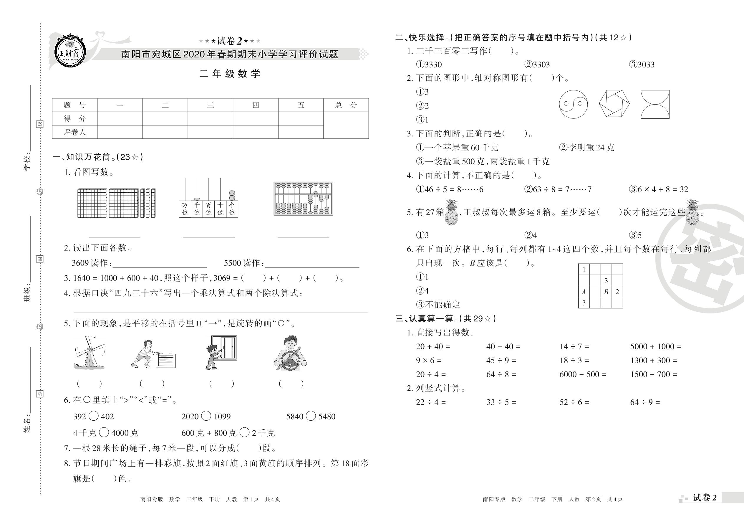 2019-2020学年第二学期南阳市宛城区二年级数学试卷(人教版)【2】
