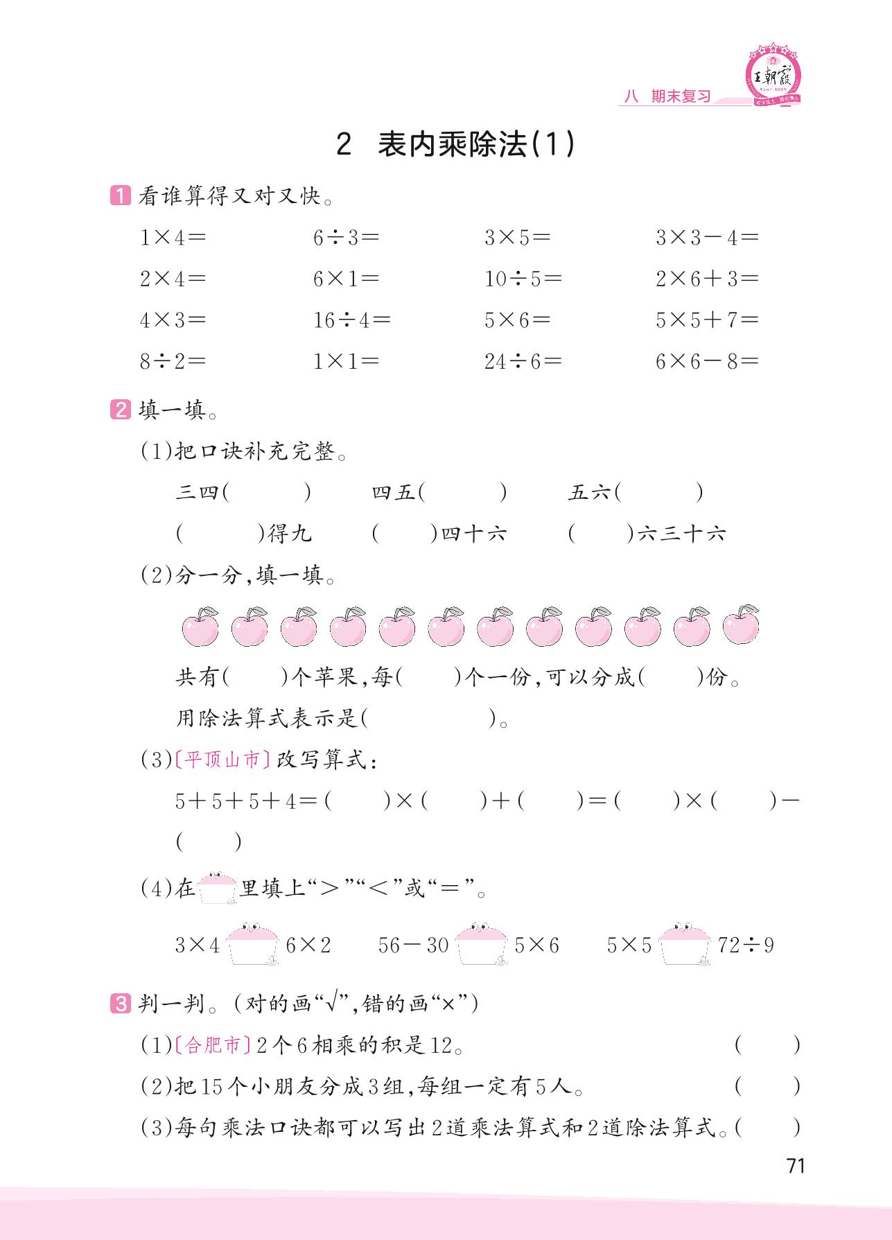 2023上册二年级数学苏教版 八 期末复习——2 表内乘除法(1)