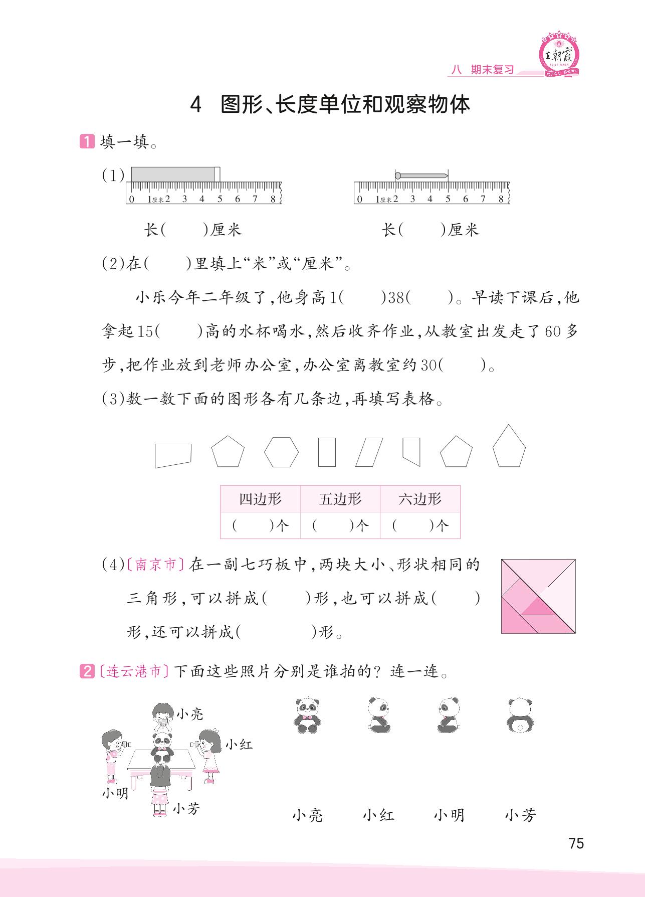2023上册二年级数学苏教版 八 期末复习——4 图形、长度单位和观察物体