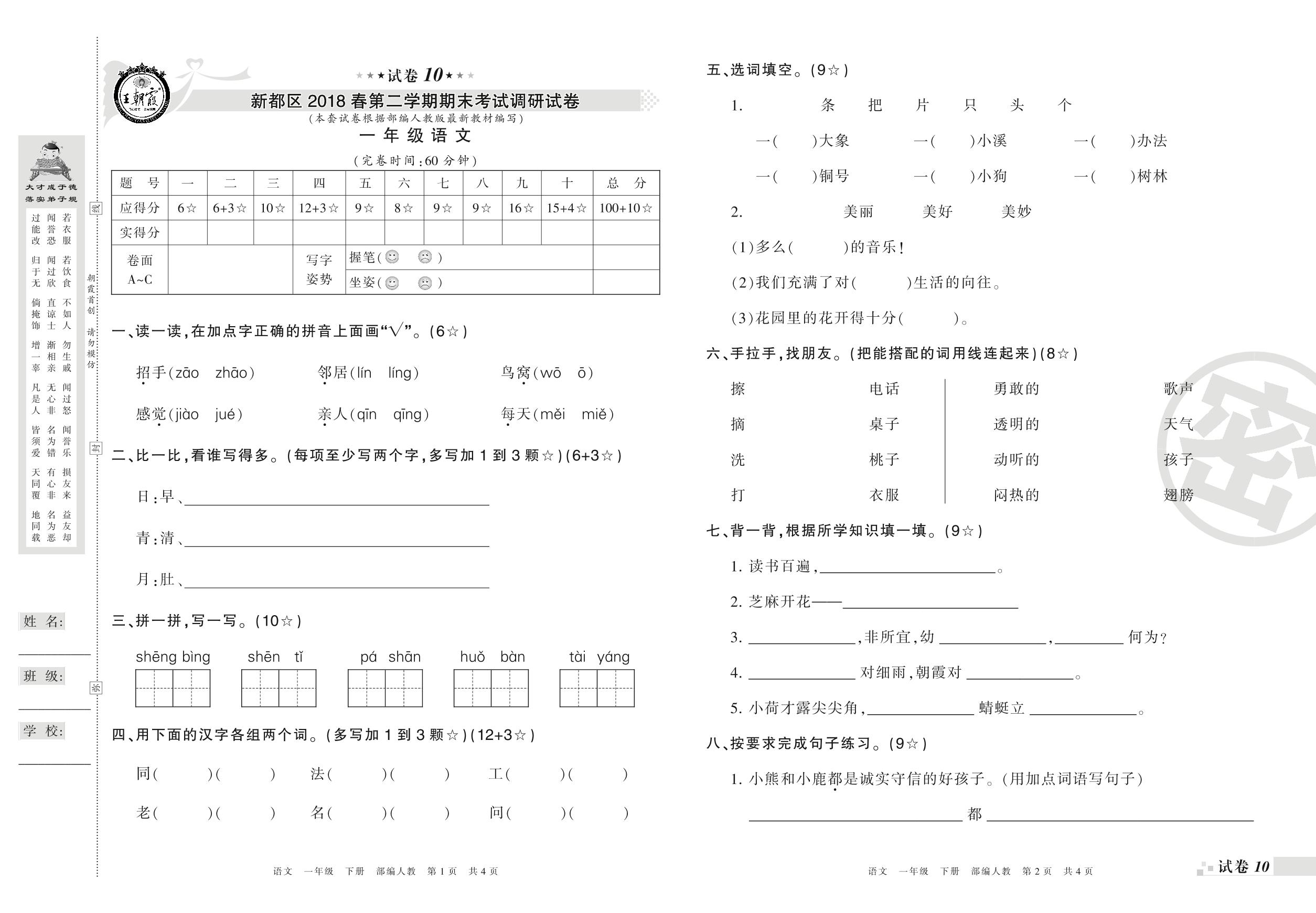 2016-2017学年第二学期成都市新都区一年级语文试卷(人教版)【10】