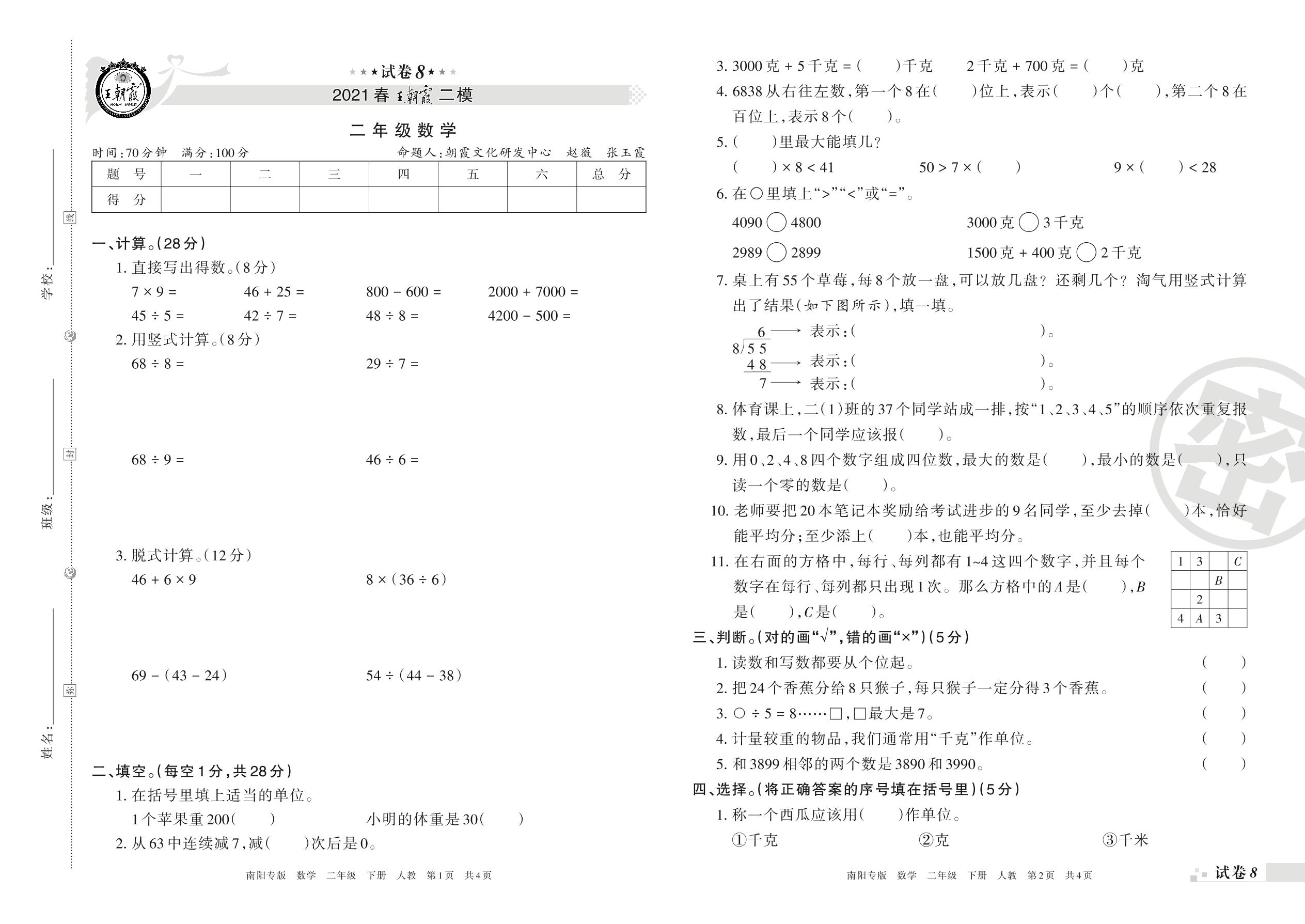 王朝霞期末模拟卷二年级下册数学(人教版)_R21080383423【8】
