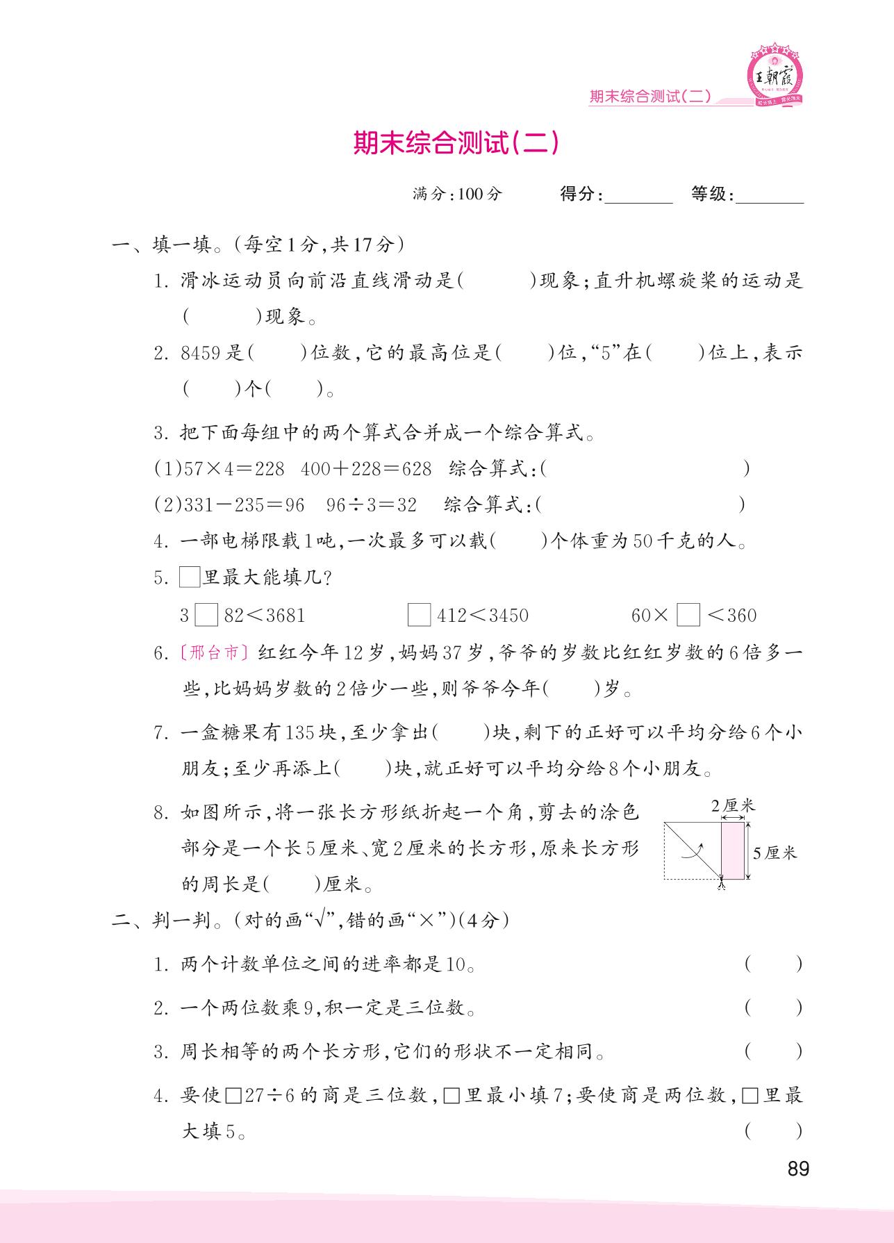 2023上册三年级数学冀教版 期末综合测试(二)