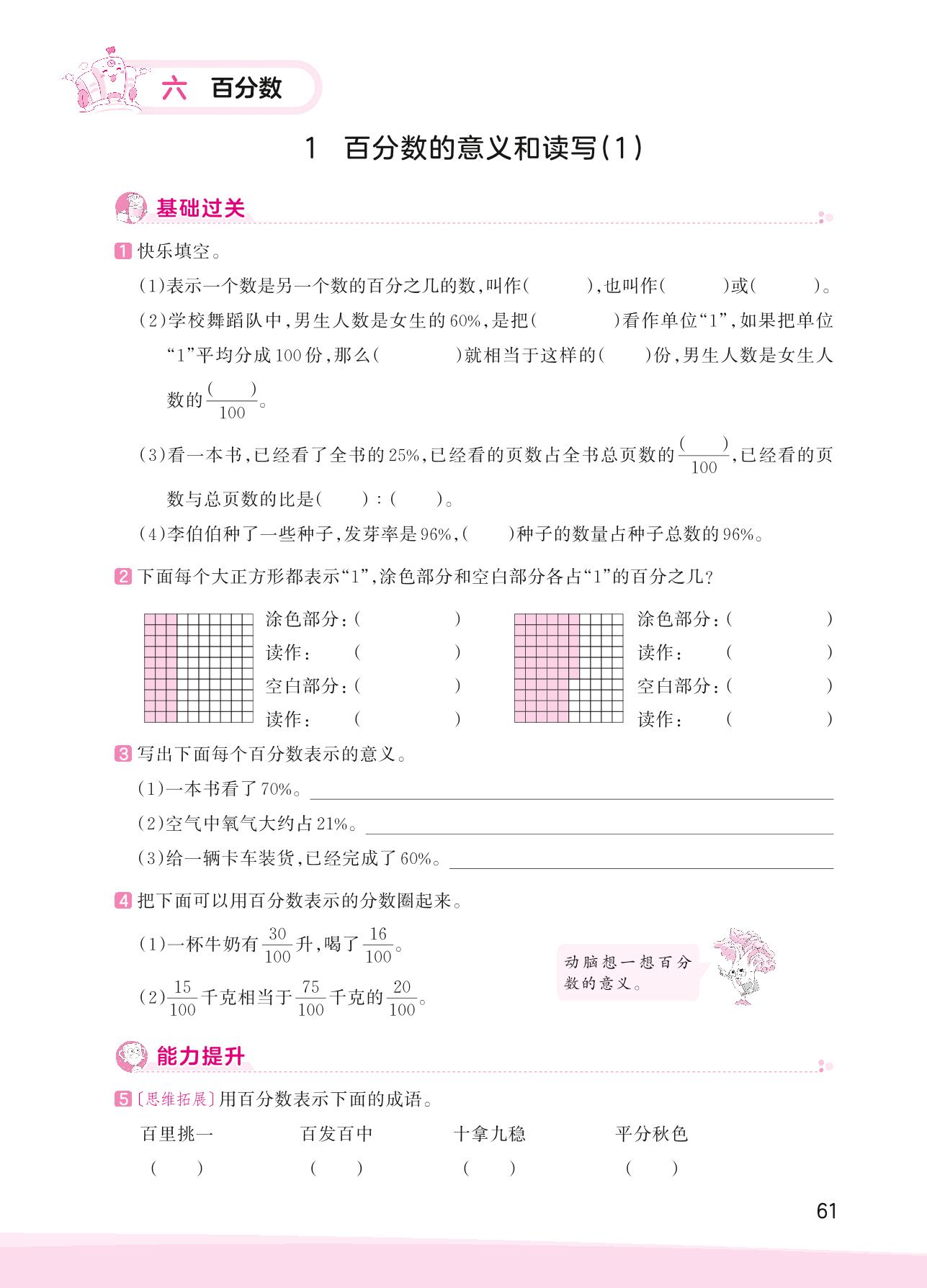 2023上册六年级数学苏教版 六 百分数——1 百分数的意义和读写(1)
