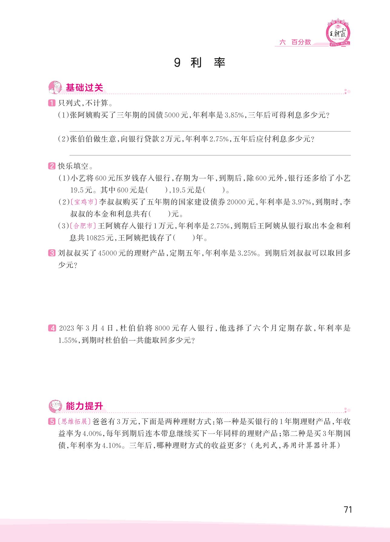2023上册六年级数学苏教版 六 百分数——9 利率
