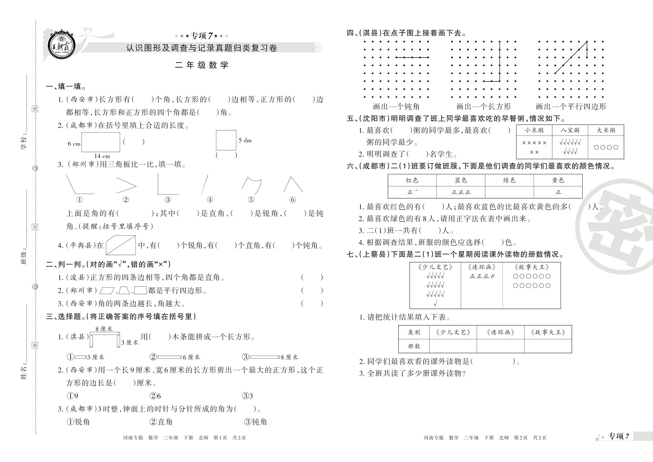 王朝霞期末专项卷——认识图形及调查与记录真题归类复习、新颖题速递:生活与数学二年级下册数学(北师版)【0】