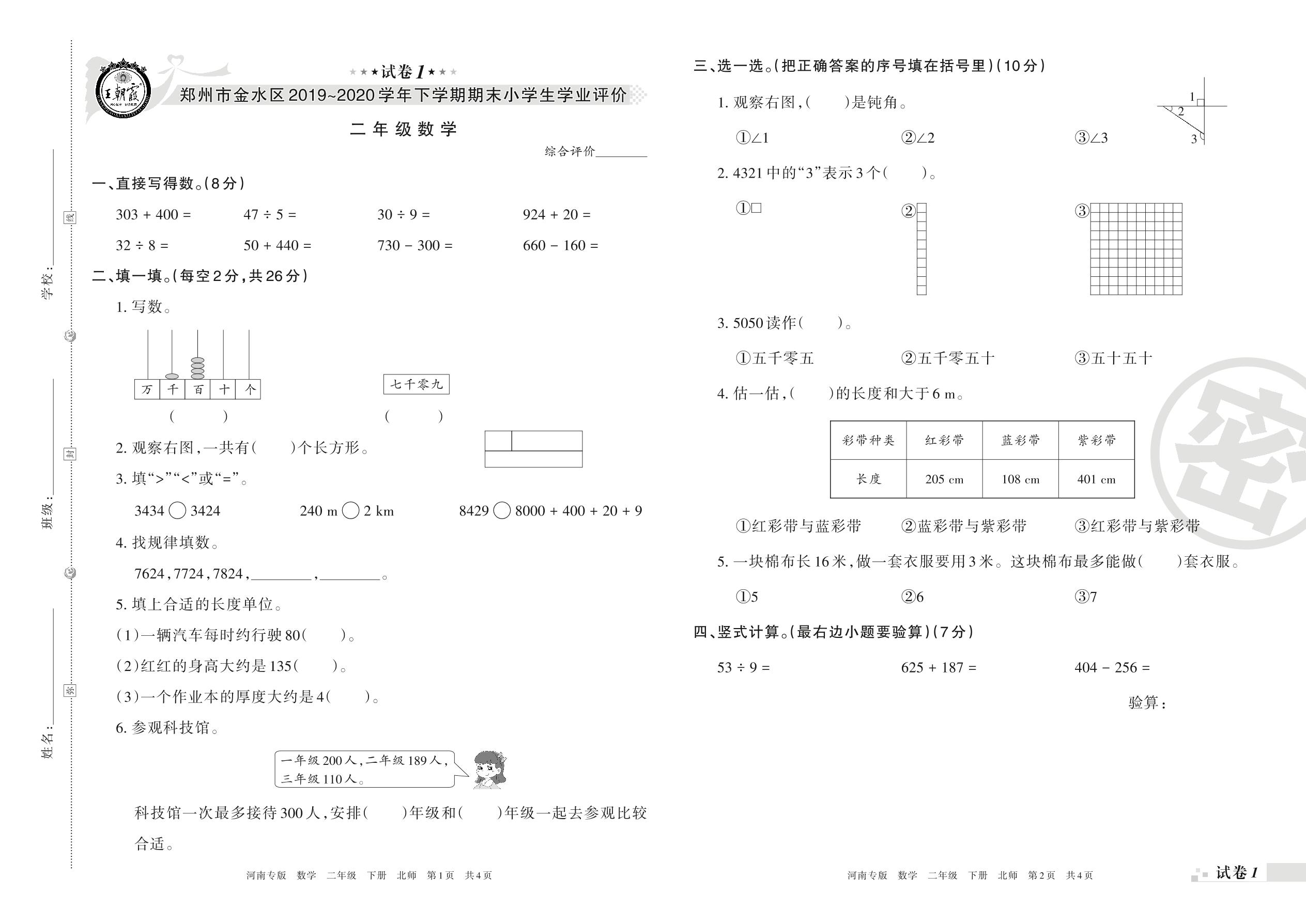 2019-2020学年第二学期郑州市金水区二年级数学试卷(北师版)_R21080383517【1】