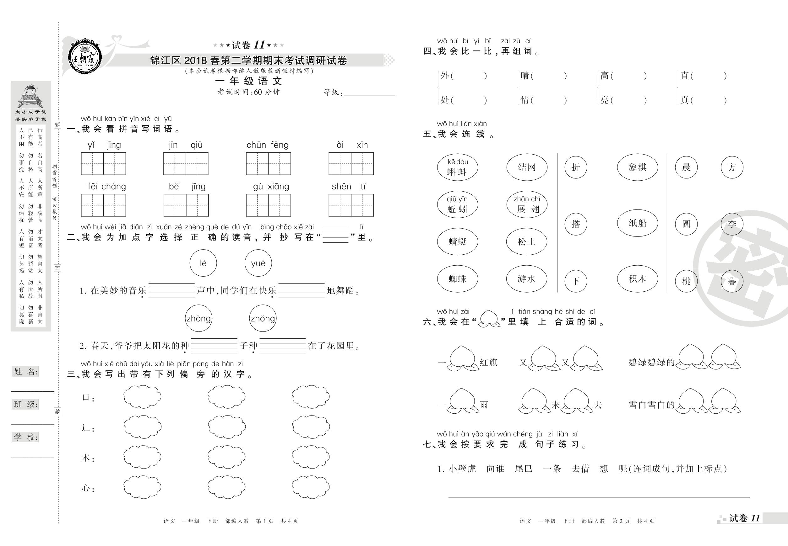 一年级语文人教版下册期末卷