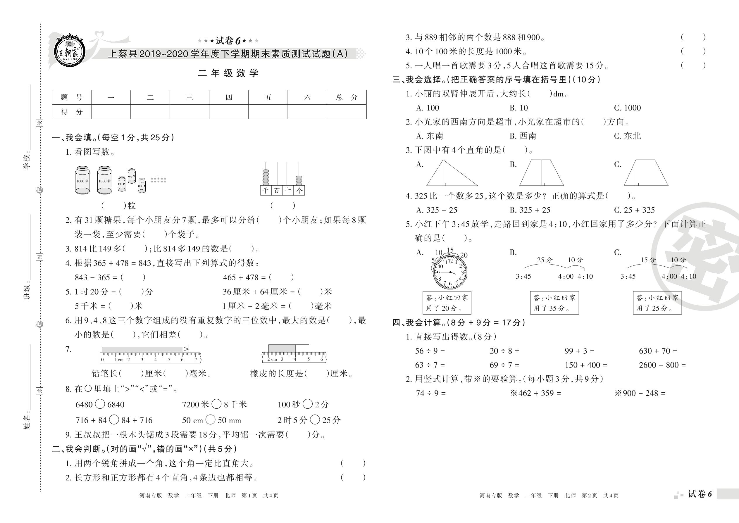 2019-2020学年第二学期驻马店市上蔡县二年级数学试卷(北师版)【6】