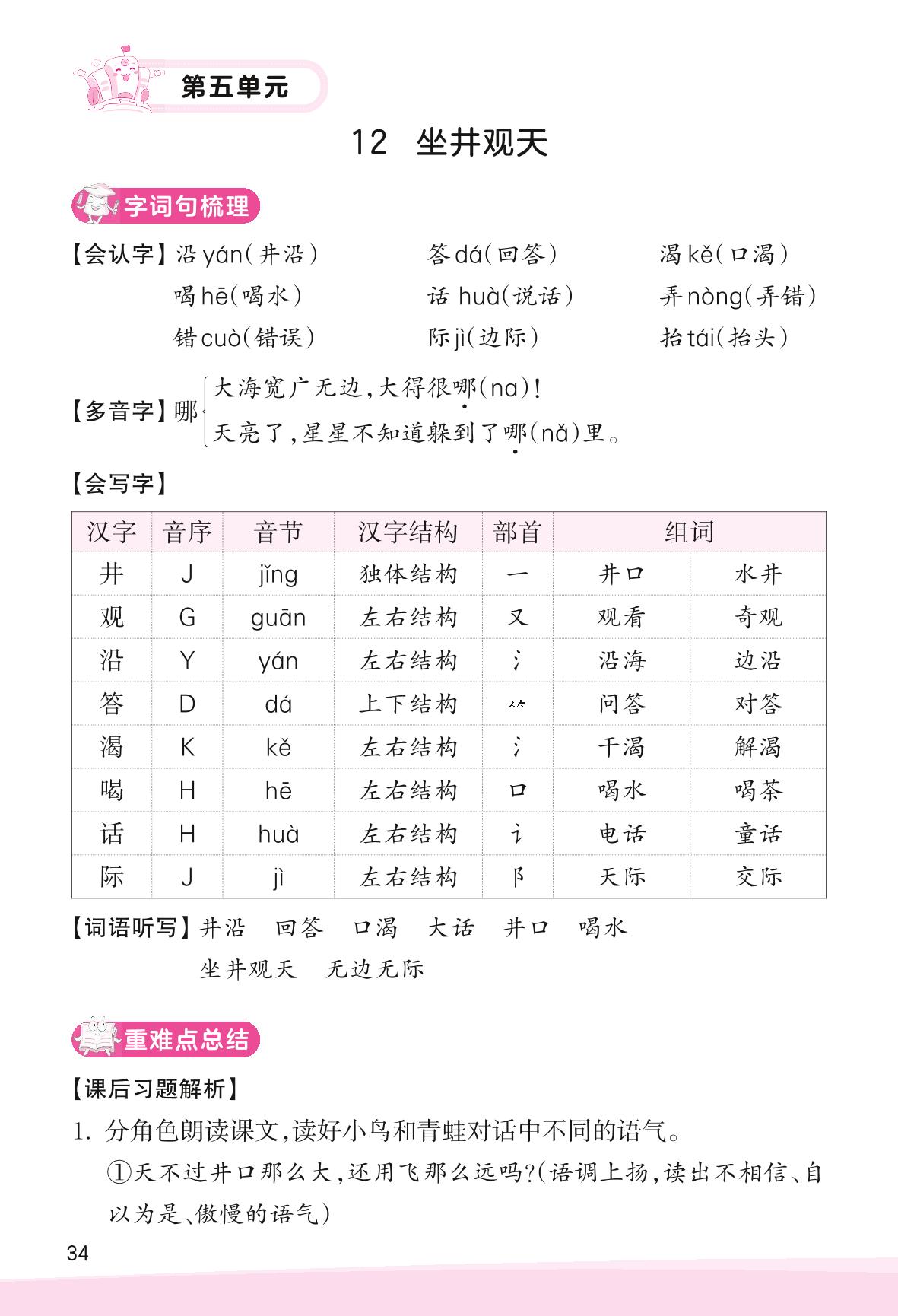 2023上册二年级语文人教版 助学手册 第五单元——12 坐井观天