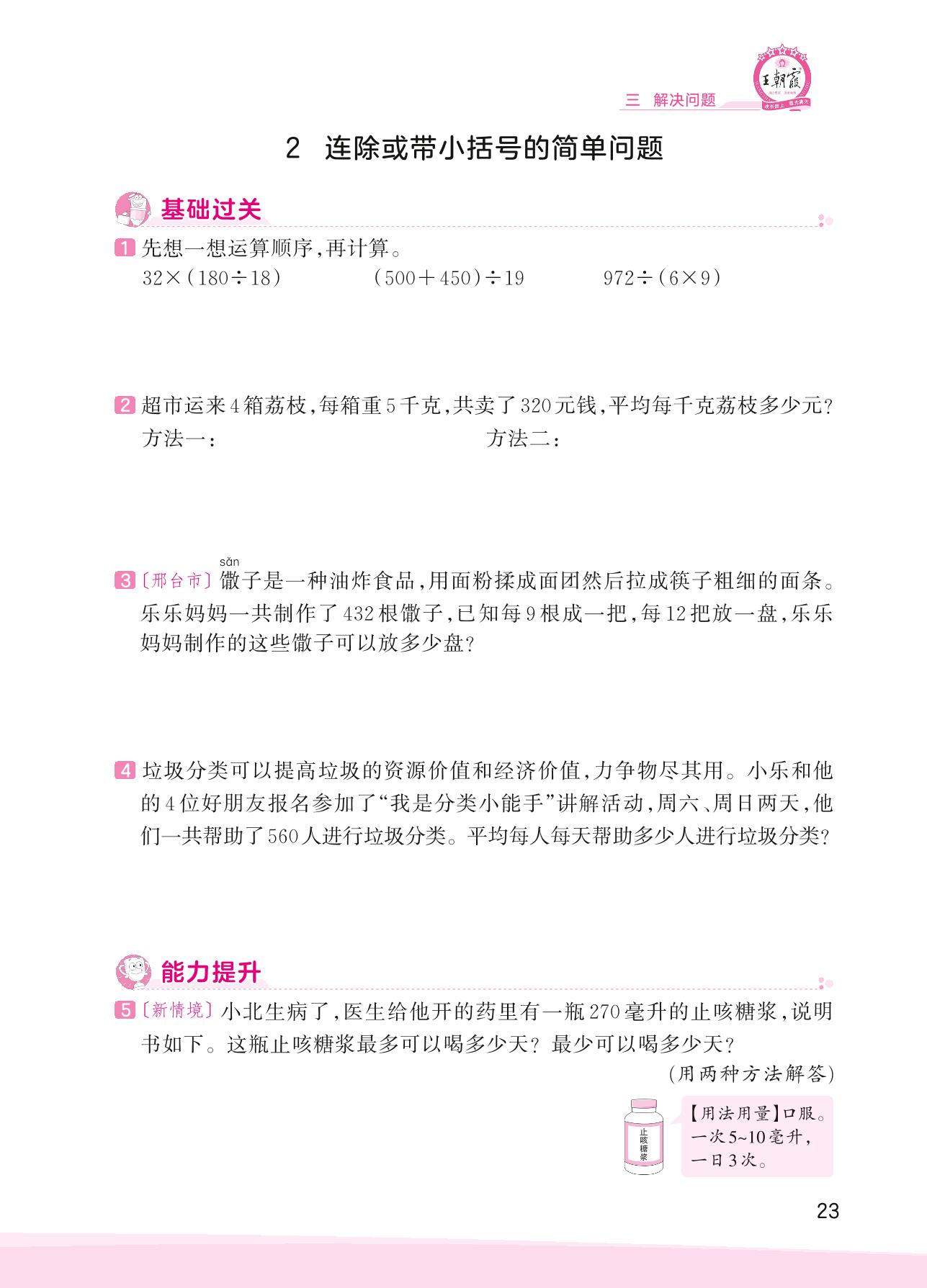 2023上册四年级数学冀教版 三 解决问题——2 连除或带小括号的简单问题
