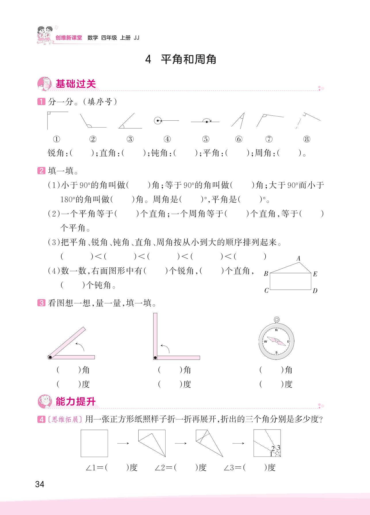 2023上册四年级数学冀教版 四 线和角——4 平角和周角