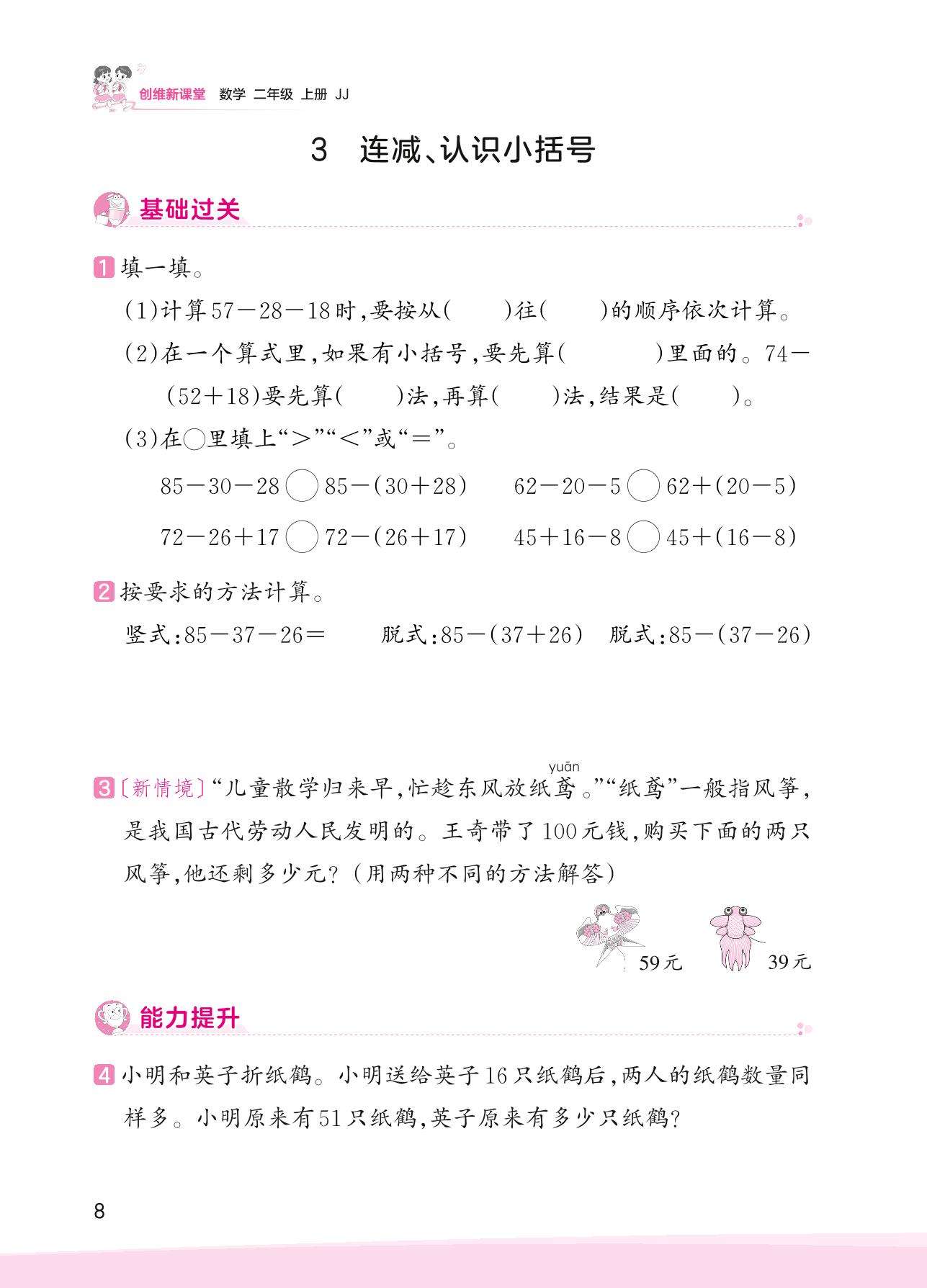 2023上册二年级数学冀教版 二 加减混合运算——3 连减、认识小括号