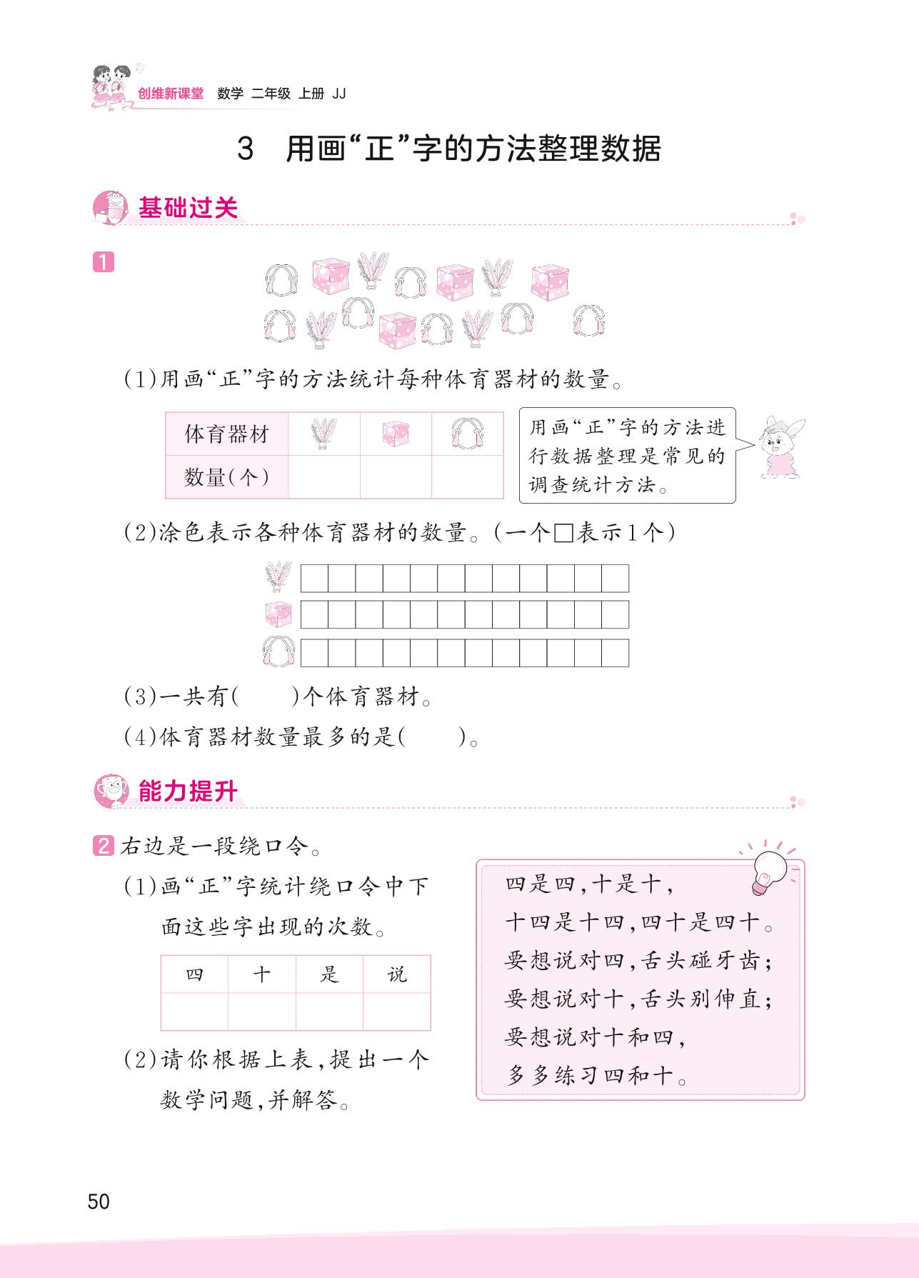 2023上册二年级数学冀教版 六 象形统计图和统计表——3 用画“正”字的方法整理数据