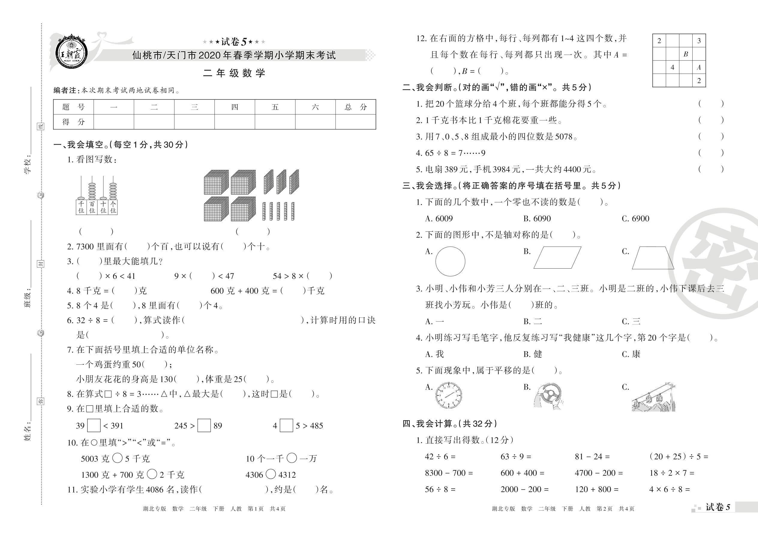 2019-2020学年第二学期仙桃市、天门市二年级数学试卷(人教版)【5】