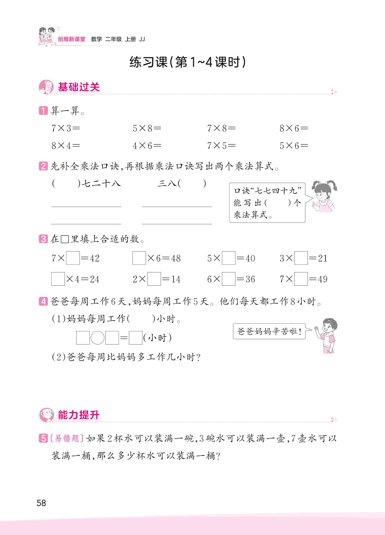 2023上册二年级数学冀教版 七 表内乘法和除法(二)——练习课(第1~4课时)