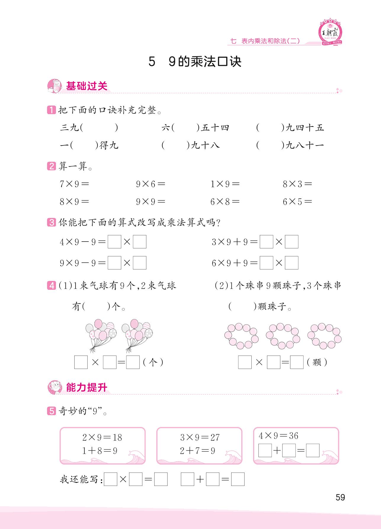 2023上册二年级数学冀教版 七 表内乘法和除法(二)——5 9的乘法口诀
