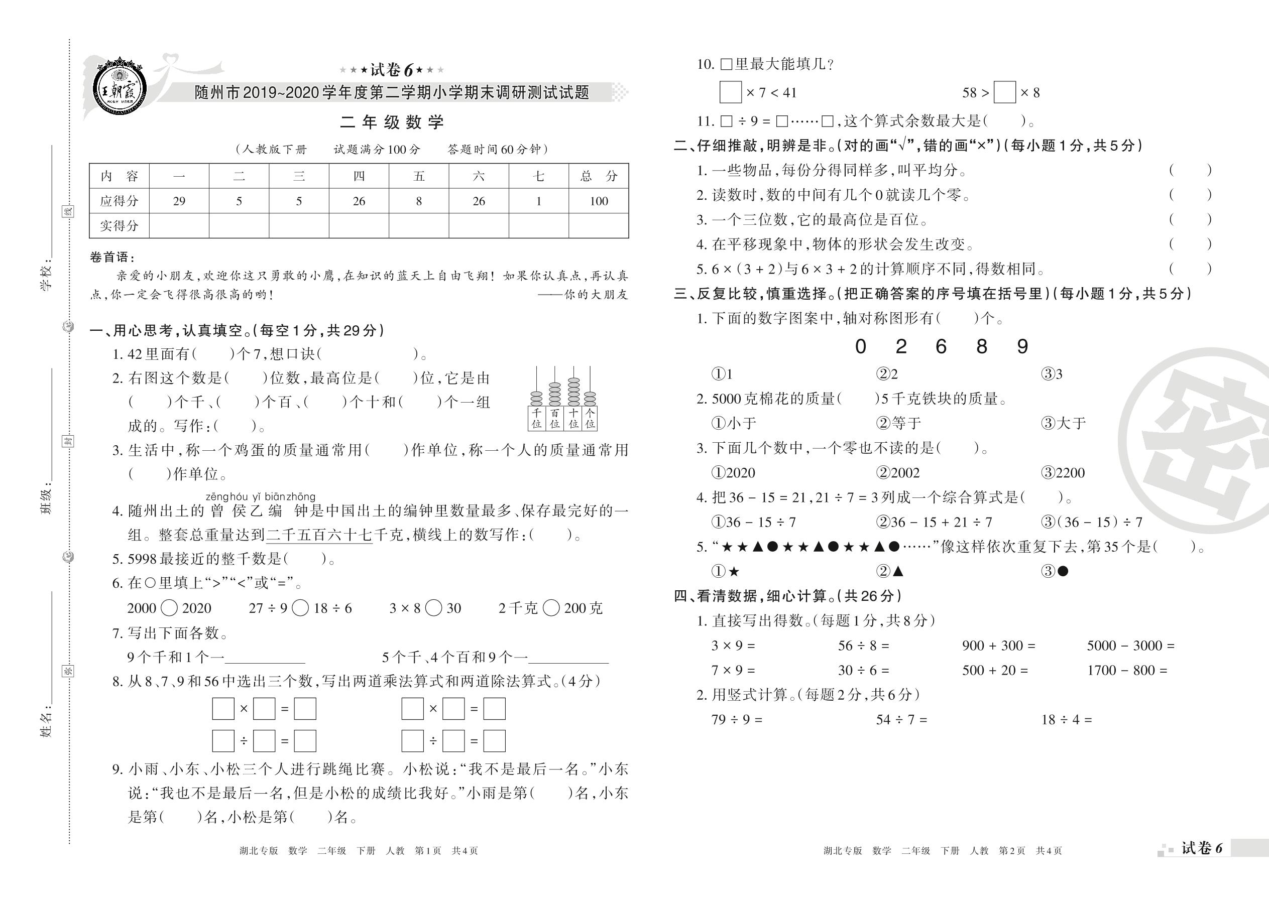 2019-2020学年第二学期随州市二年级数学试卷(人教版)【6】