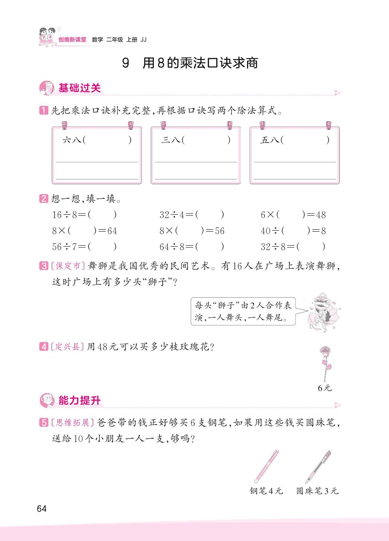 2023上册二年级数学冀教版 七 表内乘法和除法(二)——9 用8的乘法口诀求商