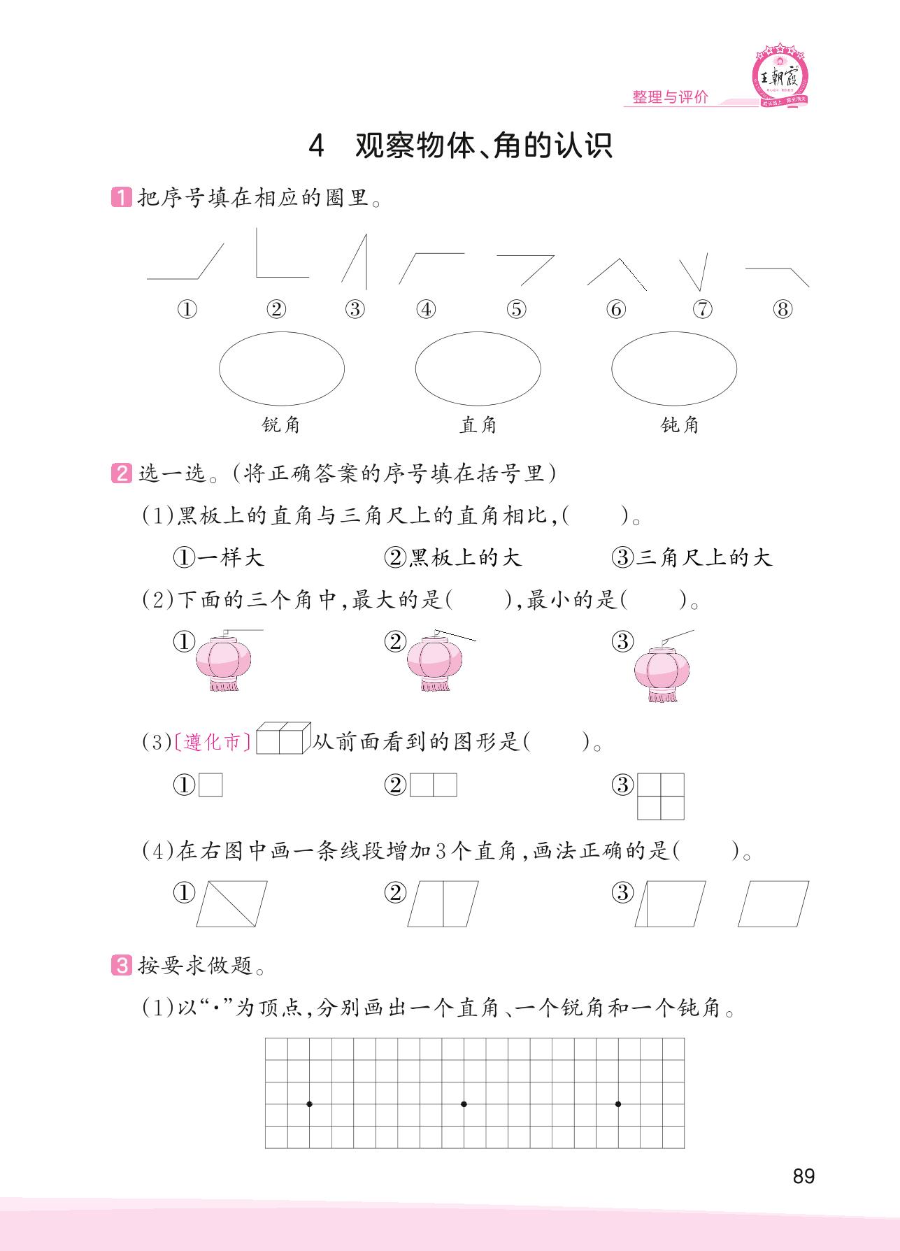 2023上册二年级数学冀教版 整理与评价——4 观察物体、角的认识
