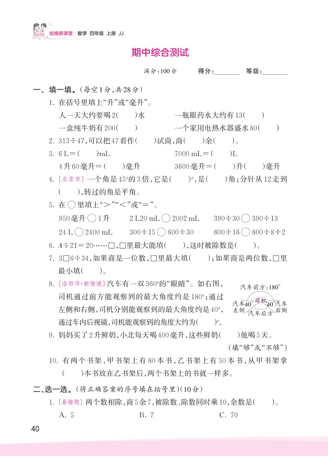 四年级数学冀教版上册期中卷