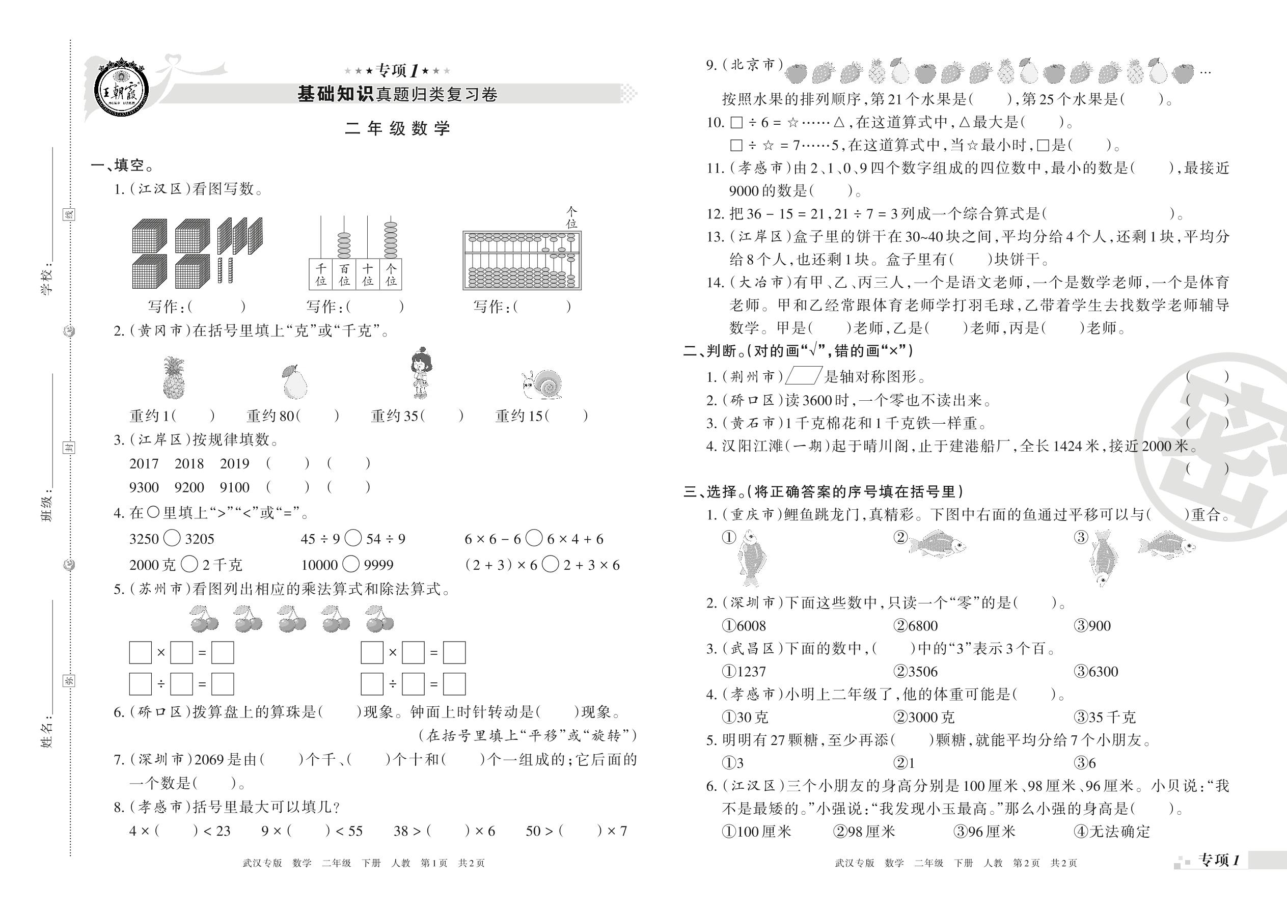 王朝霞期末专项卷——基础知识、基本运算真题归类复习二年级下册数学(人教版)【0】